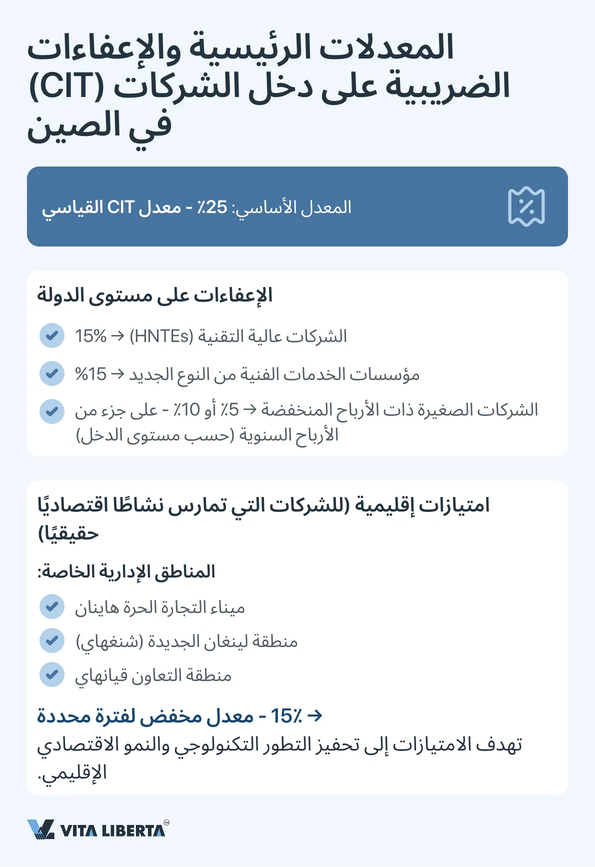 - الإعفاءات العامة: بالنسبة للمؤسسات عالية التقنية (HNTEs) ومؤسسات الصيانة الفنية من النوع الجديد، تم تخفيض المعدل إلى 15٪. يمكن للمؤسسات الصغيرة ذات الأرباح المنخفضة تطبيق معدل فعلي قدره 5٪ أو 10٪ على جزء من الأرباح السنوية.