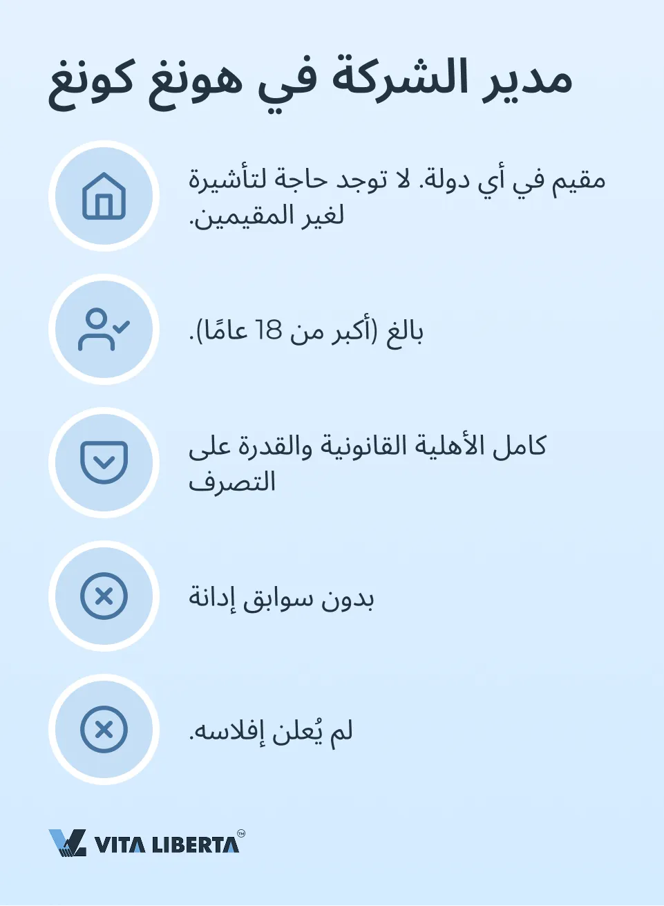 يجب أن يكون مدير الشركة في هونغ كونغ أكبر من 18 عامًا، وأن يتمتع بالأهلية القانونية والقدرة على التصرف. كما يجب ألا يكون لديه سجل إدانات بجرائم مؤسسية أو أن يكون قد أُعلن إفلاسه. لا تهم جنسية ومحل إقامة المدير.
