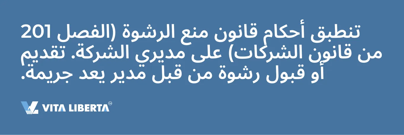 إذا أُدينت شركة بارتكاب أي من هذه الجرائم، وكانت الجريمة قد ارتُكبت بموافقة أو بتسامح من أي من مديريها، يكون ذلك المدير مذنبًا أيضًا بارتكاب الجريمة.