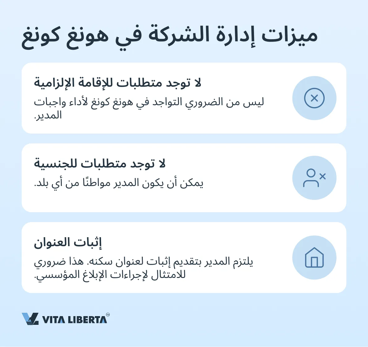 من السمات الجذابة في تشريعات هونغ كونغ عدم وجود متطلبات صارمة للإقامة والجنسية بالنسبة لمديري الشركات. هذا ما يجعل الولاية القضائية جذابة للمستثمرين الدوليين، حيث يمكنهم إدارة أعمالهم دون إلزام بالتواجد والإقامة في أراضي هونغ كونغ.