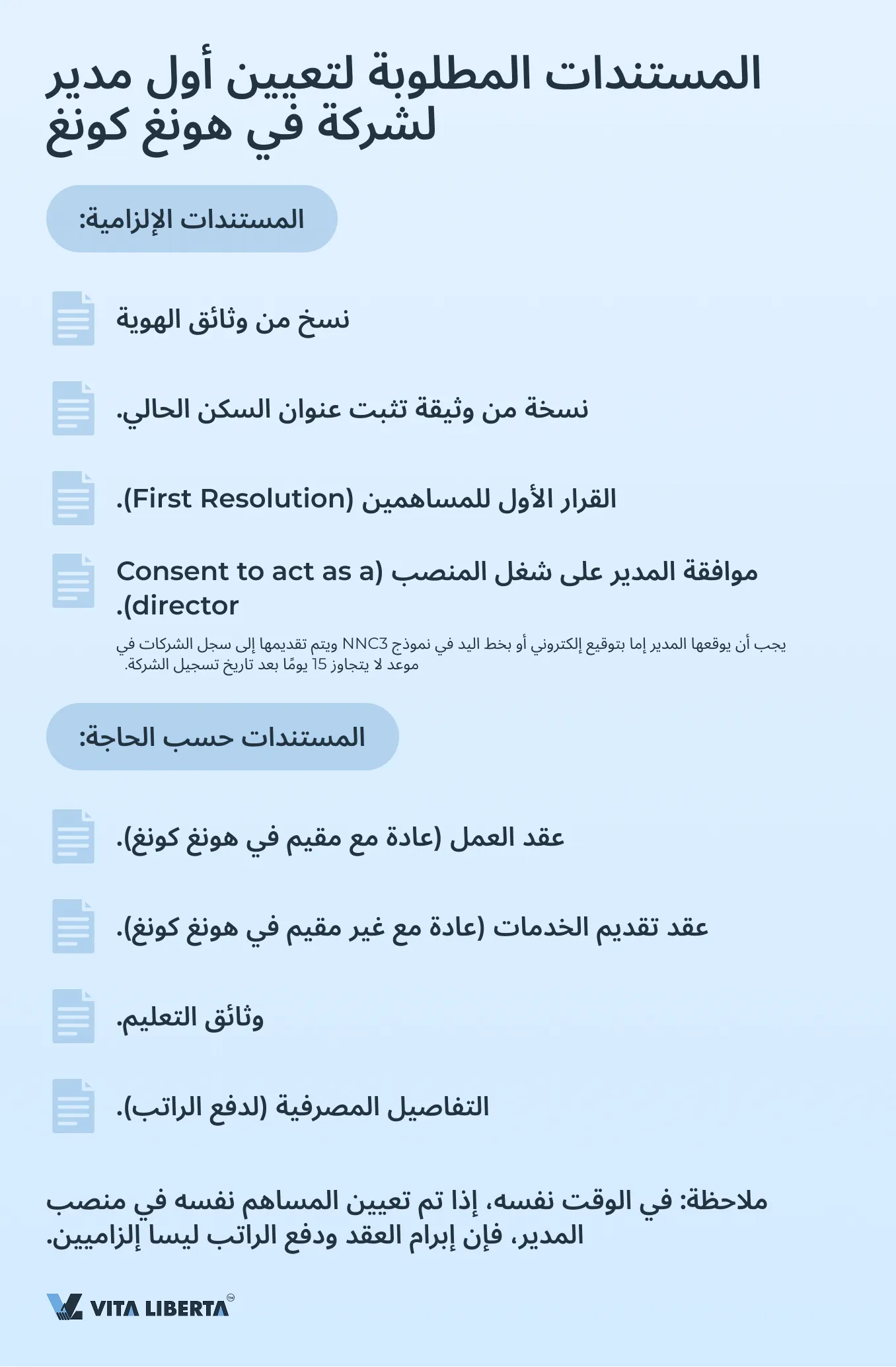 - موافقة المدير على شغل المنصب (Consent to act as a director). يجب تقديم هذه الموافقة إلى سجل الشركات في هونغ كونغ إما بشكل إلكتروني عند تسجيل الشركة (يجب أن يوقع المدير بتوقيعه الإلكتروني)، أو تقديم الموافقة في شكل ورقي (نموذج NNC3). يجب تسليم النموذج NNC3 إلى سجل الشركات في موعد لا يتجاوز 15 يومًا بعد تاريخ تسجيل الشركة.