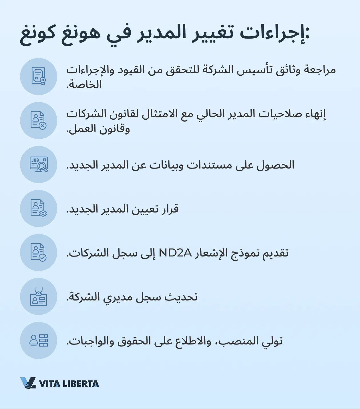 يتضمن تعيين مدير جديد عدة خطوات رئيسية: التحقق من وثائق تأسيس الشركة لمعرفة القيود، وجمع بيانات عن المدير الجديد، والحصول على الموافقة الخطية لتقلد المنصب، وتقديم نموذج ND2A إلى سجل شركات هونغ كونغ.