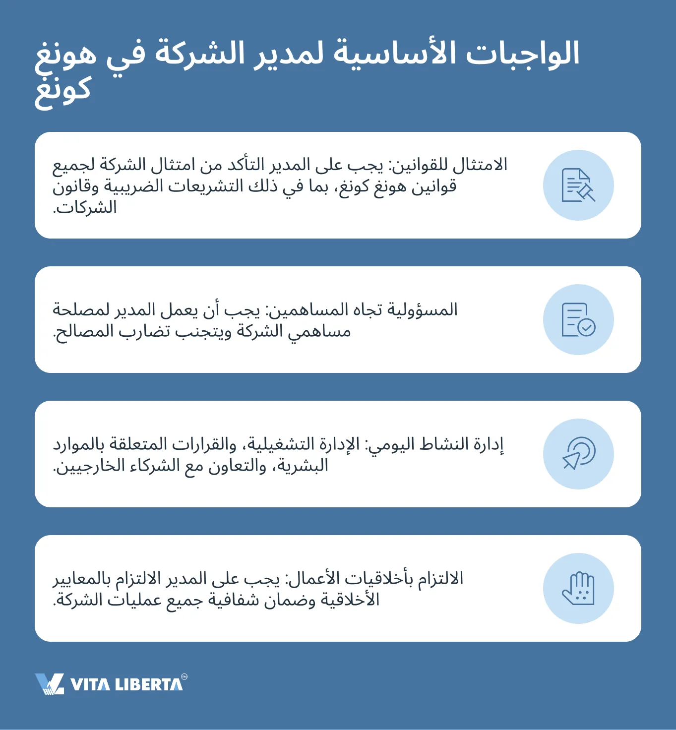 يلعب المدير دورًا رئيسيًا في ضمان النجاح التشغيلي للشركة. يعد اختيار شخص مؤهل ومسؤول لهذا المنصب حاسمًا لازدهار الأعمال على المدى الطويل. من المهم أن يفهم كل رائد أعمال الالتزامات والحقوق والمخاطر القانونية المرتبطة بتشريعات هونغ كونغ ومتطلباتها فيما يتعلق بهذا المنصب.
