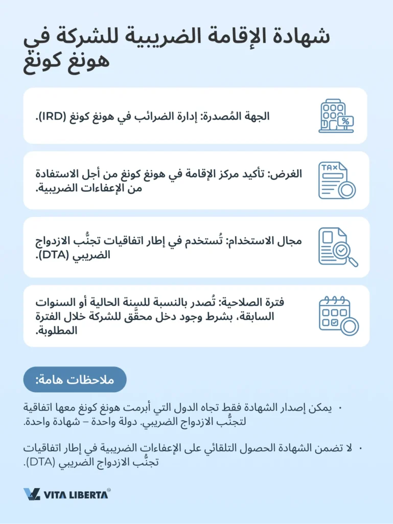 تُستخدم هذه الشهادة كدليل على مركز الإقامة في هونغ كونغ، ويمكن إصدارها بالنسبة للسنة الحالية أو السنوات السابقة، وذلك تجاه الدولة التي أبرمت هونغ كونغ معها اتفاقية لتجنُّب الازدواج الضريبي.