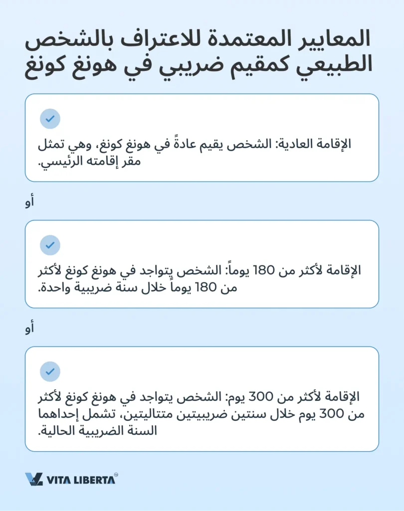 - الإقامة لأكثر من 300 يوم في سنتين: أي أن الشخص يتواجد في هونغ كونغ لأكثر من 300 يوم خلال سنتين متتاليتين، تشملان السنة الضريبية الحالية.