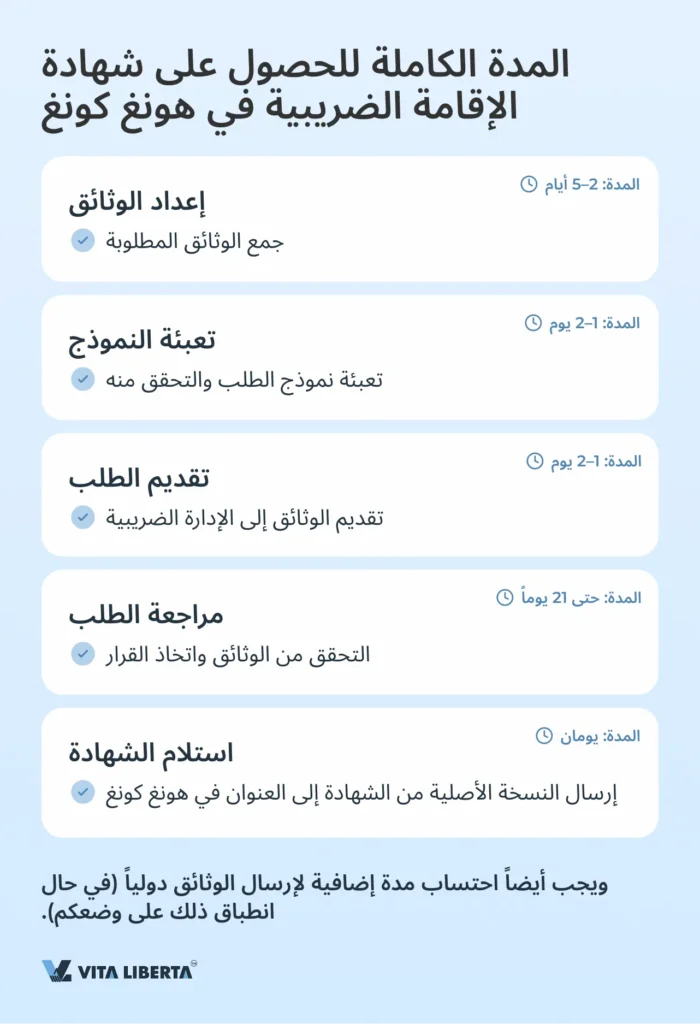 بعد تقديم الطلب، تقوم الإدارة الضريبية في هونغ كونغ بمراجعة الطلب، وتطلب معلومات إضافية عند الضرورة. وإذا كانت المعلومات المقدمة دقيقة ومُبرَّرة، تُصدر الهيئة الضريبية الشهادة. وعادةً ما تستغرق عملية مراجعة الطلب ما يصل إلى 21 يوم عمل.