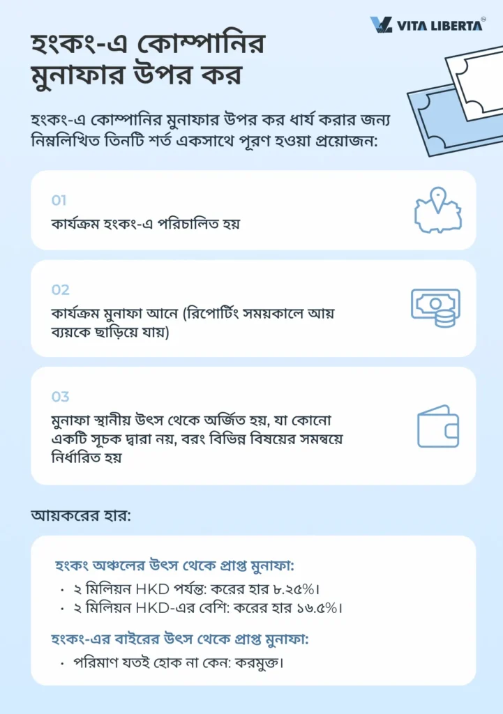 — লাভকর তখনই আদায় করা হয়, যখন ব্যবসায়িক কার্যক্রম হংকং-এ পরিচালিত হয়, লাভ অর্জিত হয়, এবং উক্ত লাভ হংকং-ভিত্তিক উৎস থেকে প্রাপ্ত হয়। এই তিনটি শর্ত একইসাথে পূরণ হতে হবে।