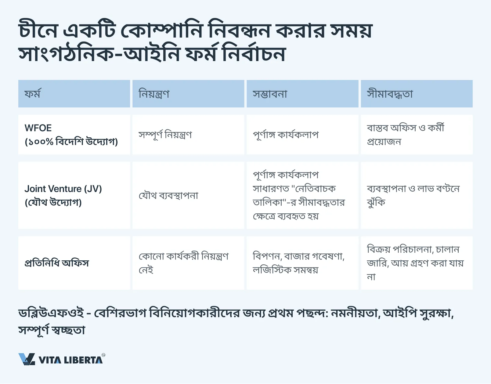 সবচেয়ে জনপ্রিয় এবং নমনীয় ফর্ম হল ১০০% বিদেশী মূলধনের উদ্যোগ (হোলি ফরেন-ওনড এন্টারপ্রাইজ, ডব্লিউএফওই)। এটি বিনিয়োগকারীকে ব্যবসার উপর সম্পূর্ণ নিয়ন্ত্রণ প্রদান করে, বৌদ্ধিক সম্পত্তি আরও ভালভাবে সুরক্ষিত করে এবং সম্পূর্ণ স্বচ্ছতা নিশ্চিত করে। ডব্লিউএফওই বেশিরভাগ ক্ষেত্রের জন্য উপযুক্ত: বাণিজ্য, পরিষেবা, উৎপাদন, গবেষণা ও উন্নয়ন। যৌথ উদ্যোগগুলি সাধারণত তৈরি করা হয় যখন এটি “নেতিবাচক তালিকা” দ্বারা সরাসরি প্রয়োজন হয় বা স্থানীয় অংশীদারের সম্পদ এবং বাজারে প্রবেশের জন্য কৌশলগতভাবে প্রয়োজনীয়।