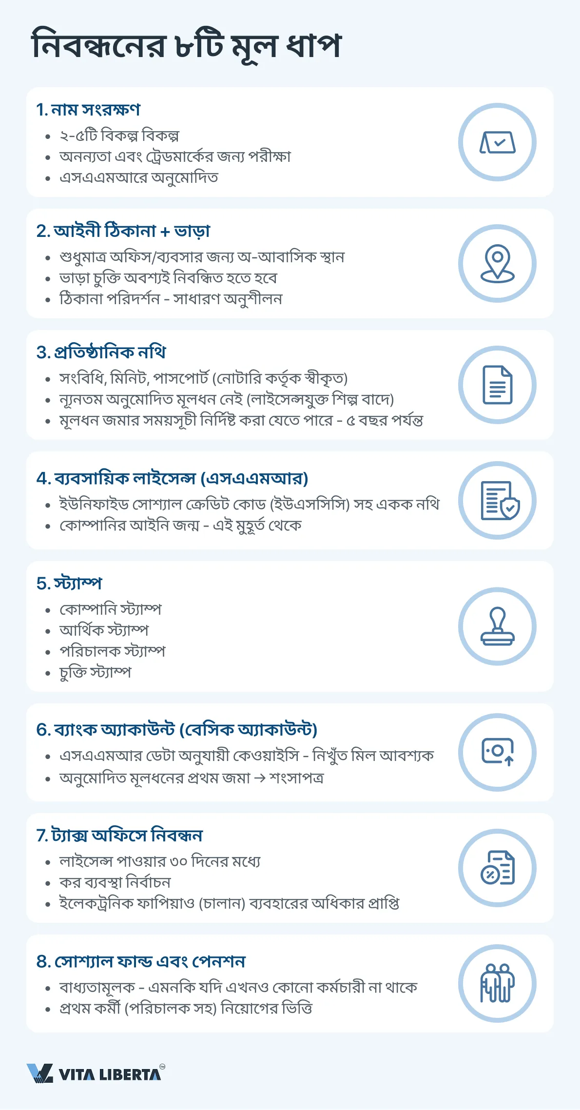 ৬. কর্পোরেট ব্যাংক অ্যাকাউন্ট খোলা এবং অনুমোদিত মূলধনের প্রথম অংশ জমা দেওয়া।