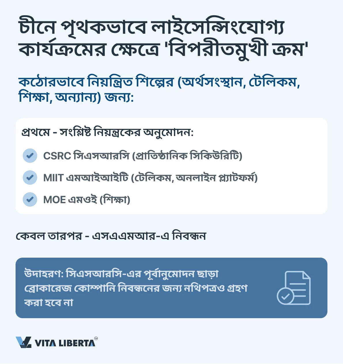 একাধিক কঠোর নিয়ন্ত্রিত খাতের (অর্থসংস্থান, টেলিযোগাযোগ, বিদেশী অংশগ্রহণে শিক্ষা ইত্যাদি) জন্য বৈধতা প্রদানের একটি বিপরীতমুখী ক্রম কার্যকর রয়েছে। এসব ক্ষেত্রে বিনিয়োগকারীকে প্রথমে সংশ্লিষ্ট শিল্প নিয়ন্ত্রকের কাছ থেকে নীতিগত অনুমোদন সংগ্রহ করতে হয় এবং কেবল তারপরই এসএএমআর-এ কোম্পানি নিবন্ধন করার অধিকার পায়।