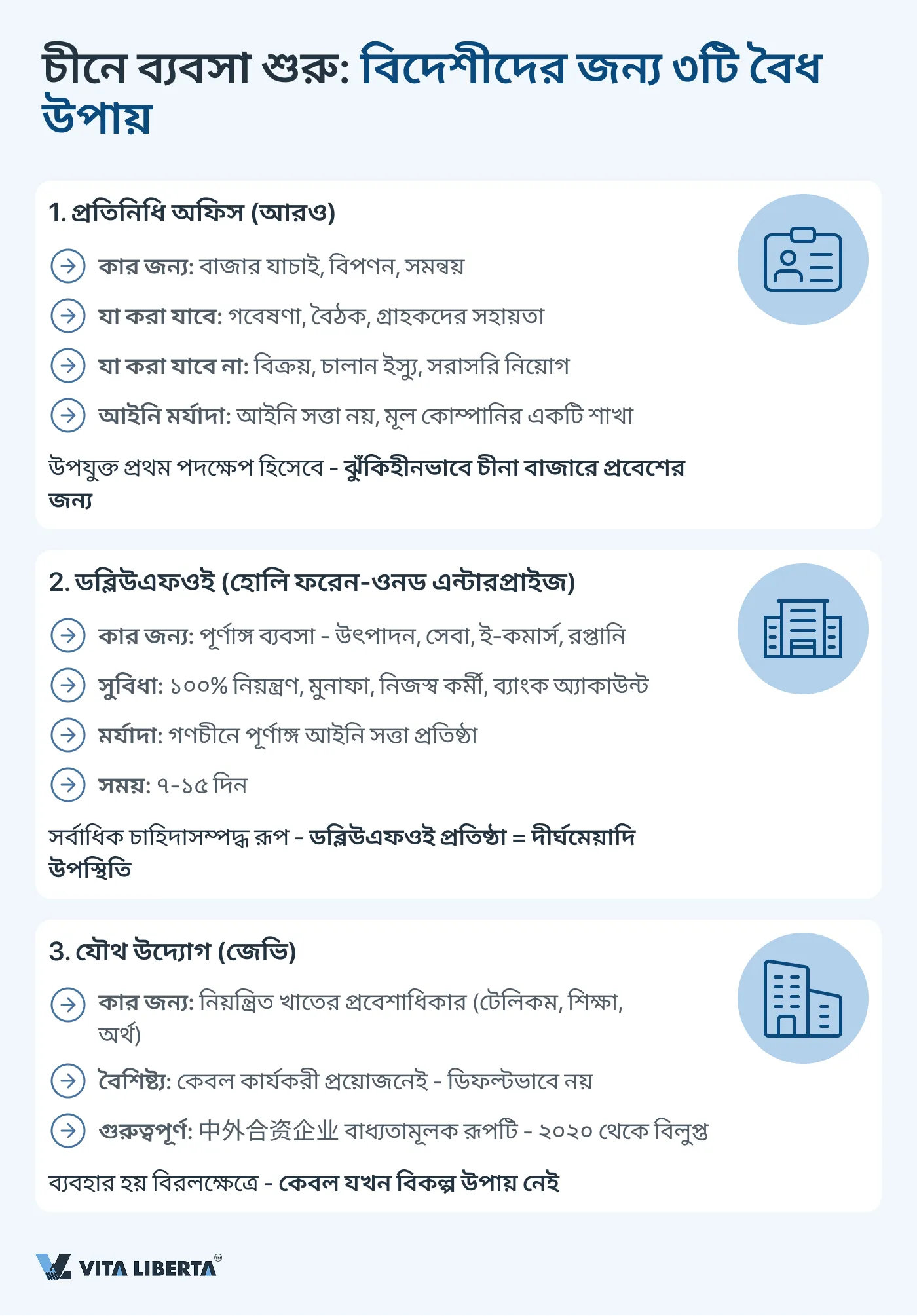 দীর্ঘমেয়াদী এবং স্বাধীন ব্যবসা পরিচালনার জন্য বিক্রয়, কর্মচারী নিয়োগ এবং মুনাফা অর্জনের অধিকার সহ সর্বোত্তম পছন্দ হল WFOE (হোলি ফরেন–ওনড এন্টারপ্রাইজ)। এটি ১০০% বিদেশী মূলধন সহ একটি পূর্ণাঙ্গ চীনা আইনী সত্তা, যা ব্যবসার উপর সম্পূর্ণ নিয়ন্ত্রণ দেয়। প্রতিনিধি অফিস (RO) বাণিজ্যিক কার্যকলাপ পরিচালনার অনুমতি দেয় না, এবং যৌথ উদ্যোগ (JV) আজকাল প্রধানত আইন দ্বারা নিয়ন্ত্রিত শিল্পে (যেমন টেলিযোগাযোগ বা শিক্ষা) প্রবেশের জন্য ব্যবহৃত হয়।