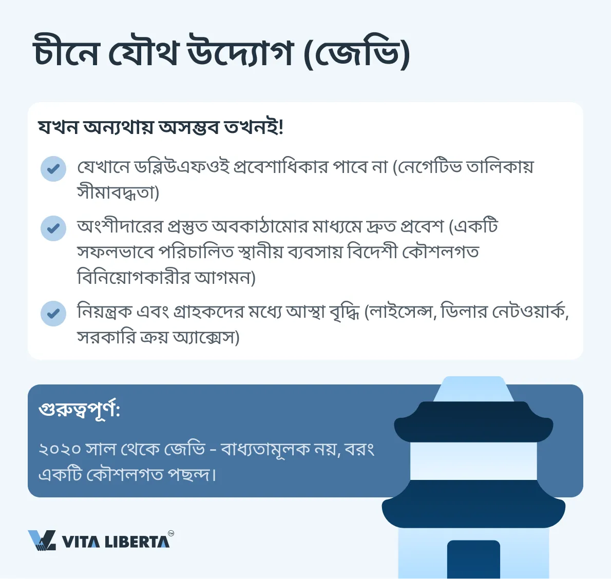 উদাহরণ: অটোমোটিভ শিল্পে (প্রতিমূল্য অঞ্চলের বাইরে, যেমন জিনানের নতুন জেলা) ২০২৫ সাল পর্যন্তICE উৎপাদন সহ জেভিতে বিদেশীর ভাগে ৫০% সীমা কার্যকর ছিল। ২০২৬ সাল থেকে ইলেকট্রিক গাড়ির জন্য এই বিধি প্রত্যাহার করা হয়েছে — কিন্তু ডিলার নেটওয়ার্ক এবং সরকারি ক্রয় অ্যাক্সেসের জন্য জেভি কার্যকর রয়ে গেছে।