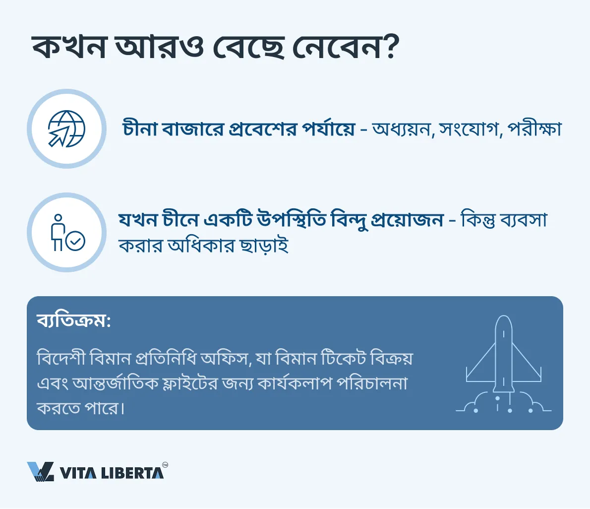 - প্রতিনিধি অফিস – শুধুমাত্র বিপণন, গবেষণা এবং লজিস্টিক সমন্বয়ের জন্য উপযুক্ত। প্রত্যক্ষ বাণিজ্যিক কার্যকলাপ নিষিদ্ধ (বিদেশী উদ্যোগের প্রতিনিধি অফিস সম্পর্কিত প্রবিধানের ধারা ৫, SAMR, ২০২৩)।