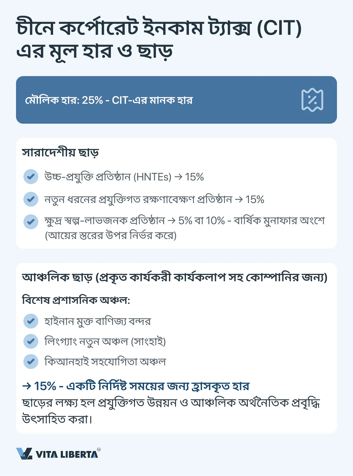 - আঞ্চলিক ছাড়: বিশেষ প্রশাসনিক অঞ্চলগুলি (যেমন, হাইনান মুক্ত বাণিজ্য বন্দর, সাংহাই-এর লিংগ্যাং নতুন অঞ্চল, কিআনহাই সহযোগিতা অঞ্চল) প্রকৃত কার্যকরী কার্যকলাপ (operational substance) সহ উৎসাহিত কোম্পানিগুলিকে একটি নির্দিষ্ট সময়ের জন্য 15% হার প্রদান করে।