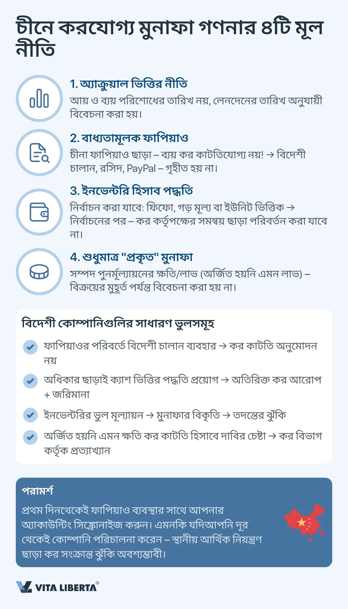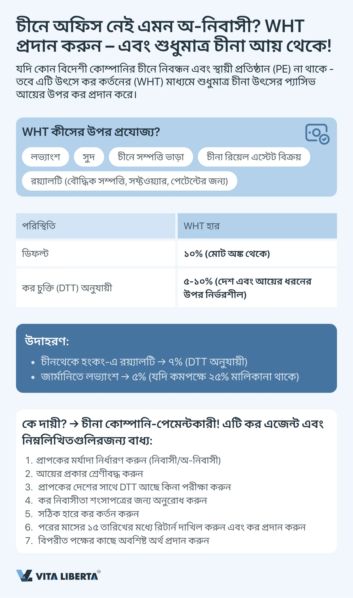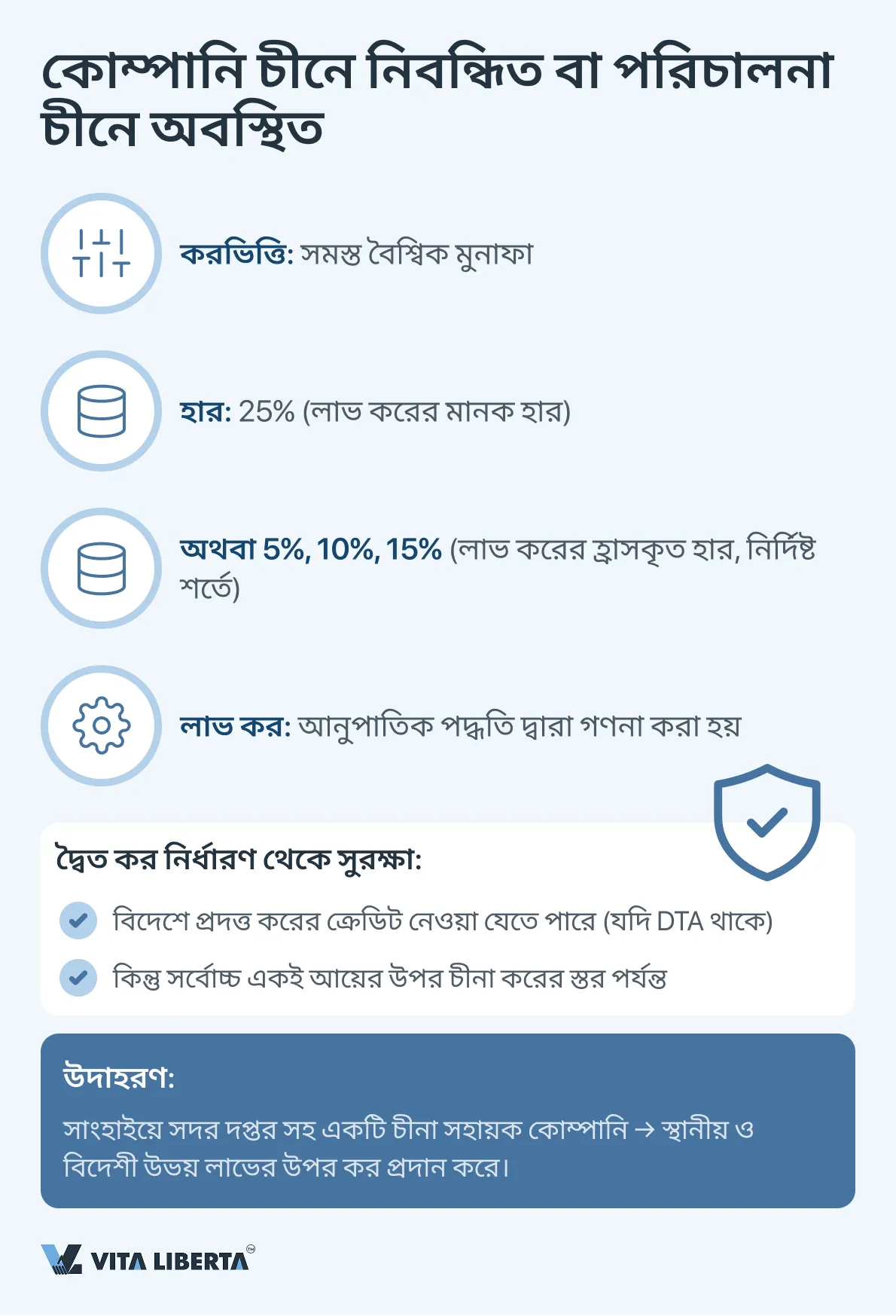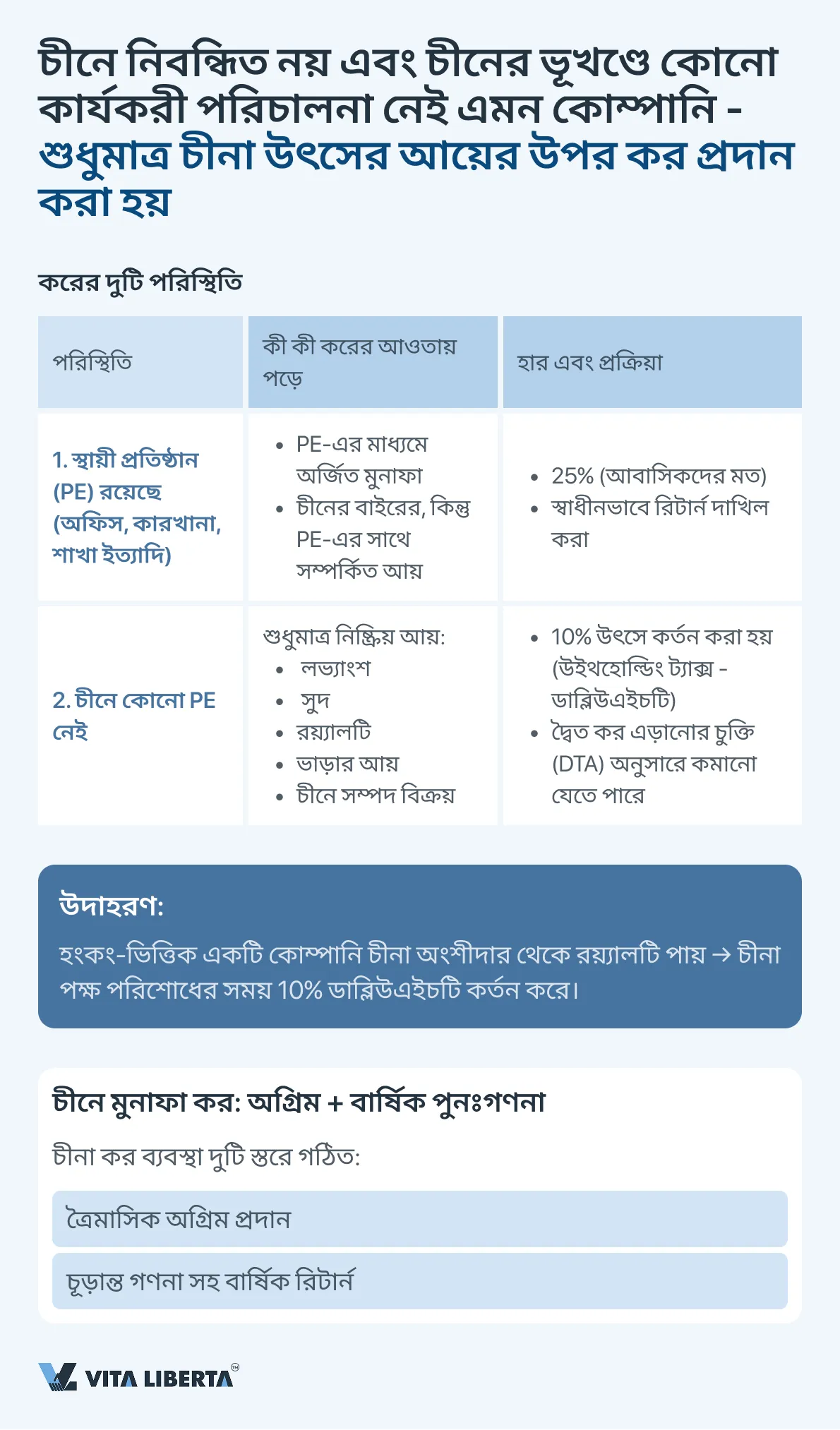 - চীনে একটি স্থায়ী প্রতিষ্ঠান (PE) থাকলে: সেই PE-এর মাধ্যমে অর্জিত মুনাফা, সেইসাথে PE-এর বাইরে প্রাপ্ত কিন্তু সেই PE-এর কার্যকলাপের সাথে কার্যকরভাবে সম্পর্কিত আয়, করের আওতাভুক্ত হবে।
