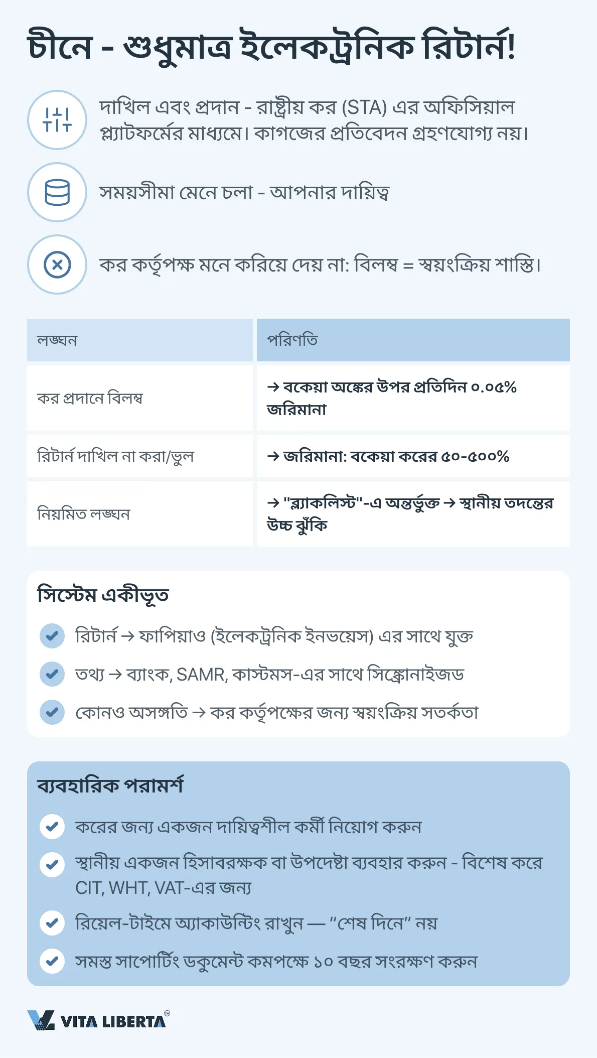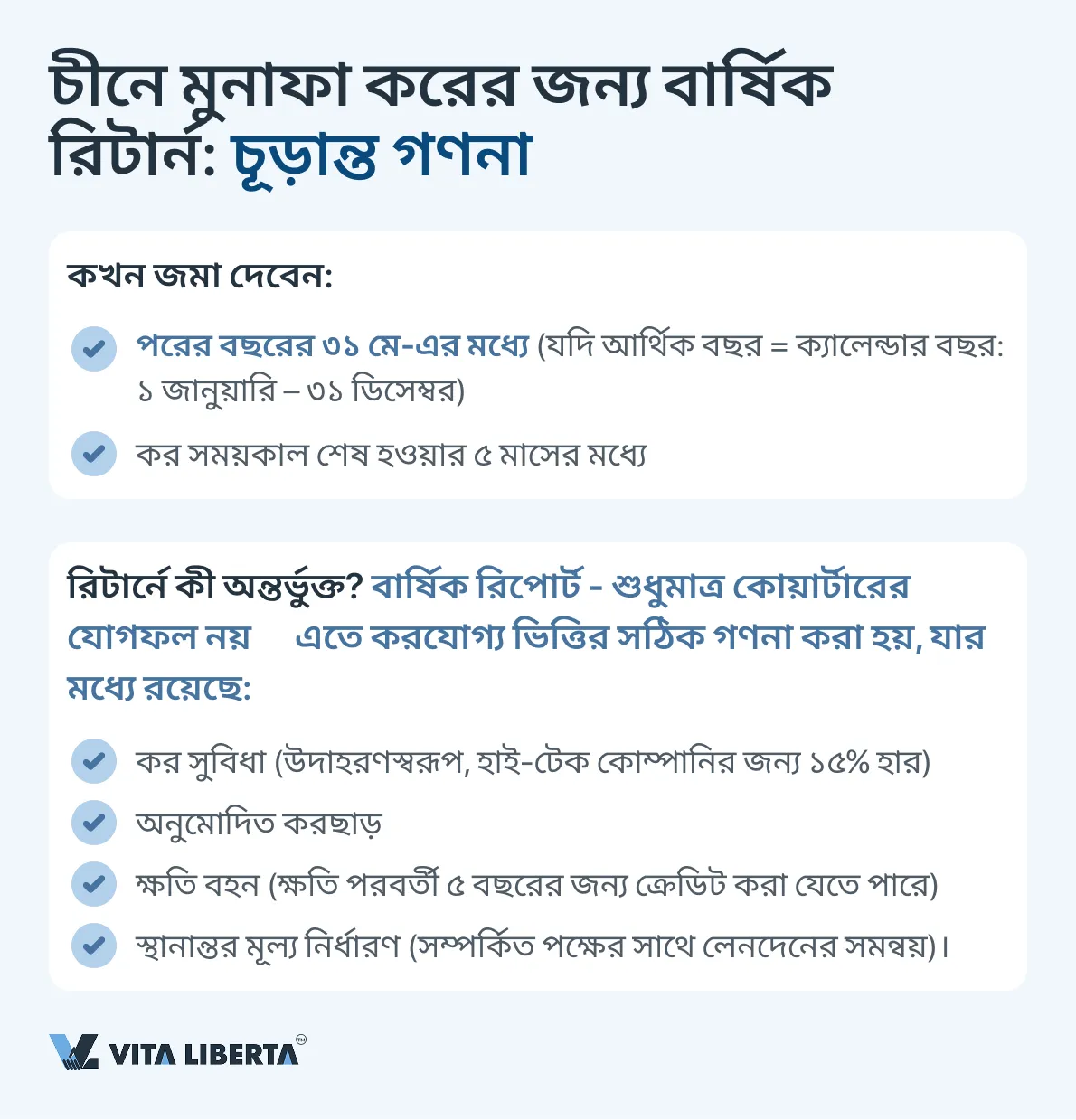 - বিষয়বস্তু: এটি একটি গুরুত্বপূর্ণ পর্যায়, যেখানে সমস্ত সুবিধা (যেমন HNTE মর্যাদা), কর কাটতি (আরঅ্যান্ডডি সুপার-কাটতি সহ), ক্ষতি বহন (৫ বছর পর্যন্ত) এবং সমন্বয় বিবেচনায় নিয়ে চূড়ান্ত কর ভিত্তি নির্ধারিত হয়। রিটার্নের সাথে প্রায়শই একটি লাইসেন্সপ্রাপ্ত চীনা ফার্ম থেকে নিরীক্ষা প্রতিবেদন সংযুক্ত করতে হয়।