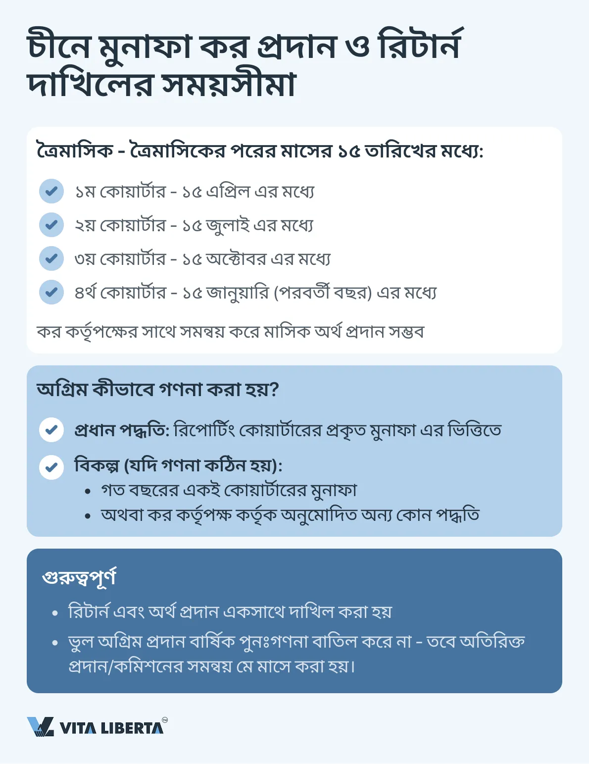 চীনের কর প্রশাসন কর্পোরেট আয়কর (CIT) এর ক্ষেত্রে অগ্রিম প্রদান (অগ্রিম) এবং চূড়ান্ত বার্ষিক গণনা নীতির উপর ভিত্তি করে গড়ে উঠেছে। এই ব্যবস্থা বাজেটে তহবিলের সমান প্রবাহ নিশ্চিত করে এবং রিপোর্টিং সময়কালের ফলাফলের ভিত্তিতে কোম্পানিগুলিকে তাদের প্রকৃত আর্থিক ফলাফলের ভিত্তিতে তাদের দায়বদ্ধতা সামঞ্জস্য করতে দেয়।