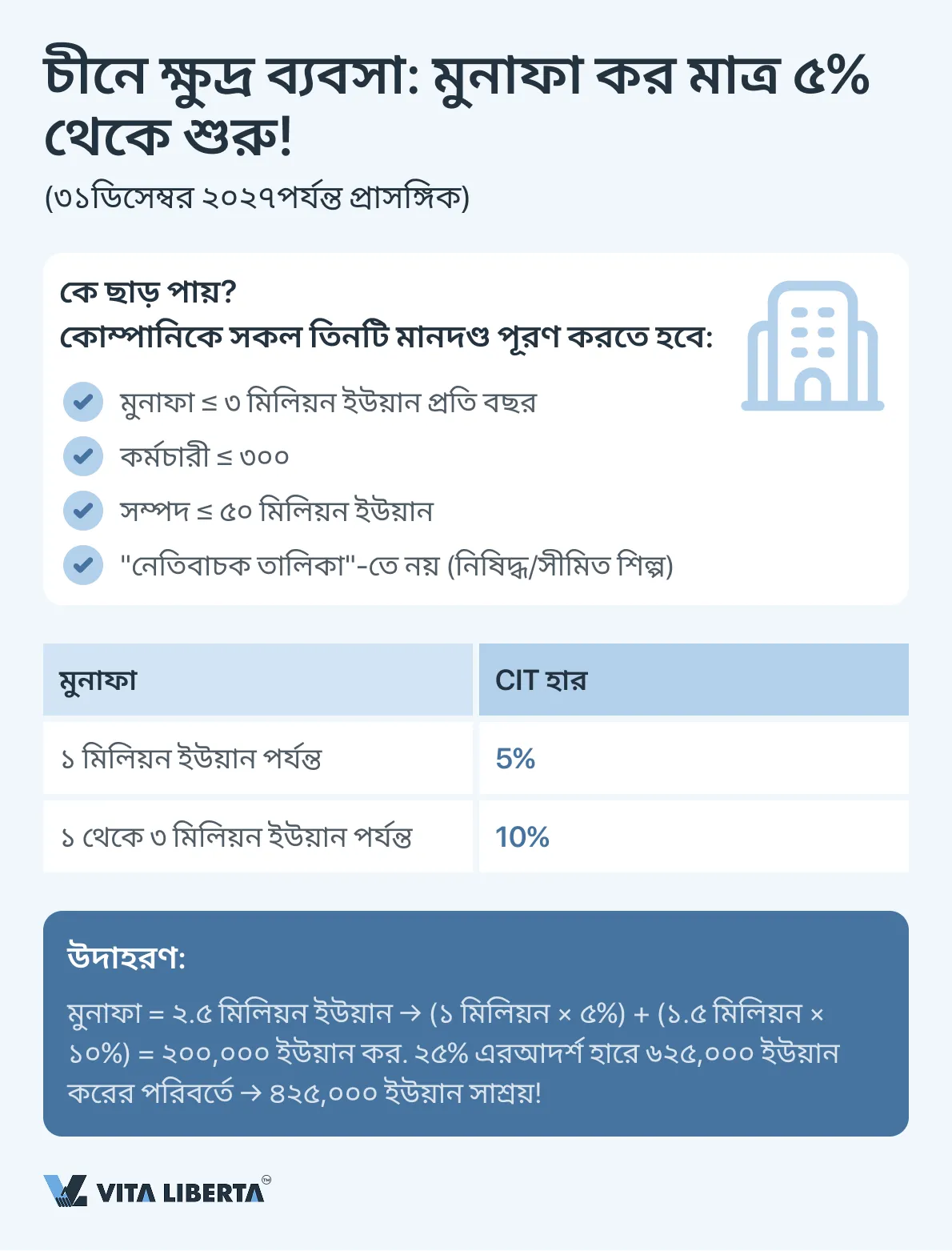 | বার্ষিক করযোগ্য মুনাফা | ≤ ৩ মিলিয়ন চীনা ইউয়ান (CNY) | কর বছর জন্য গণনা করা হয়। |