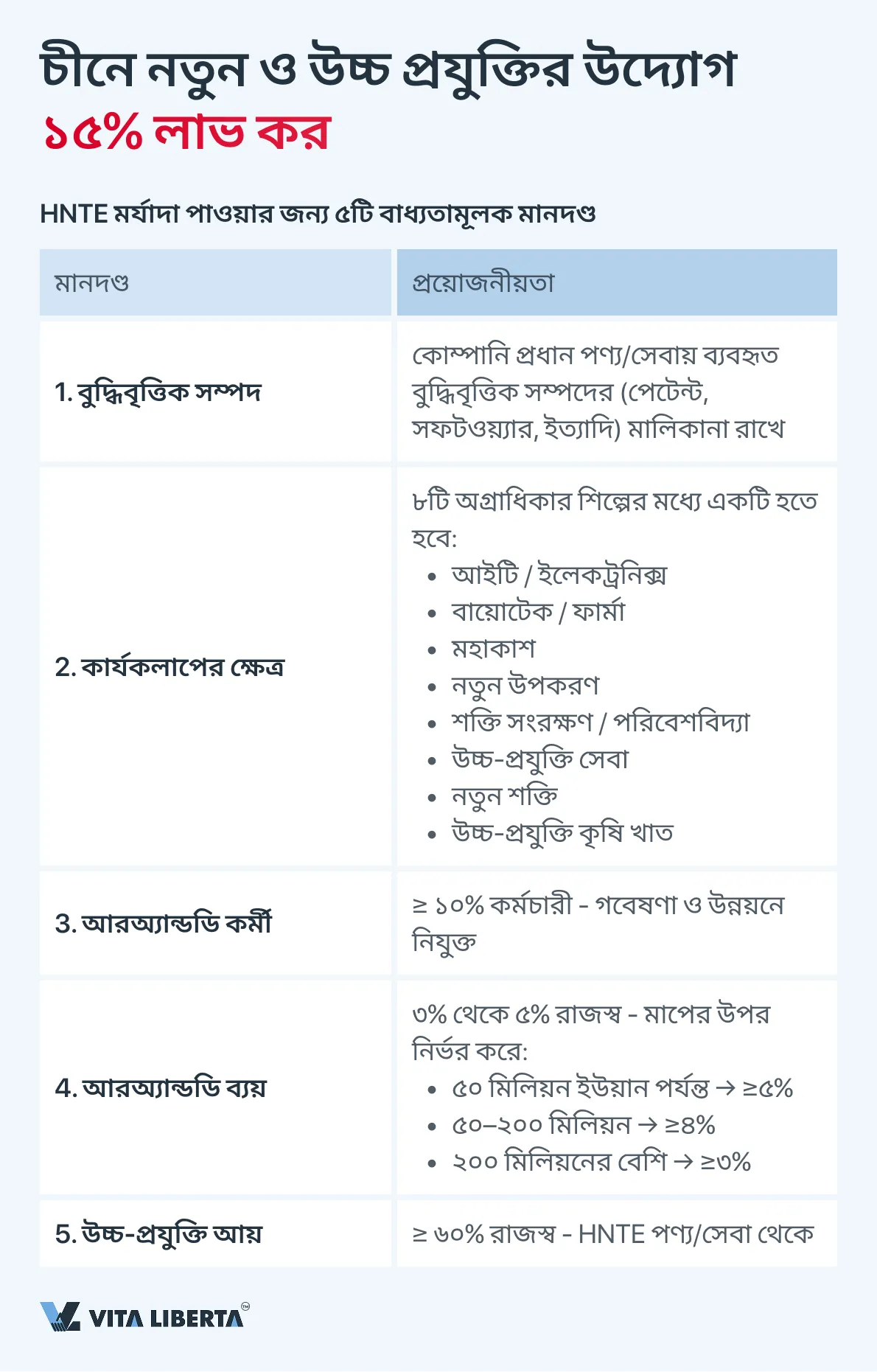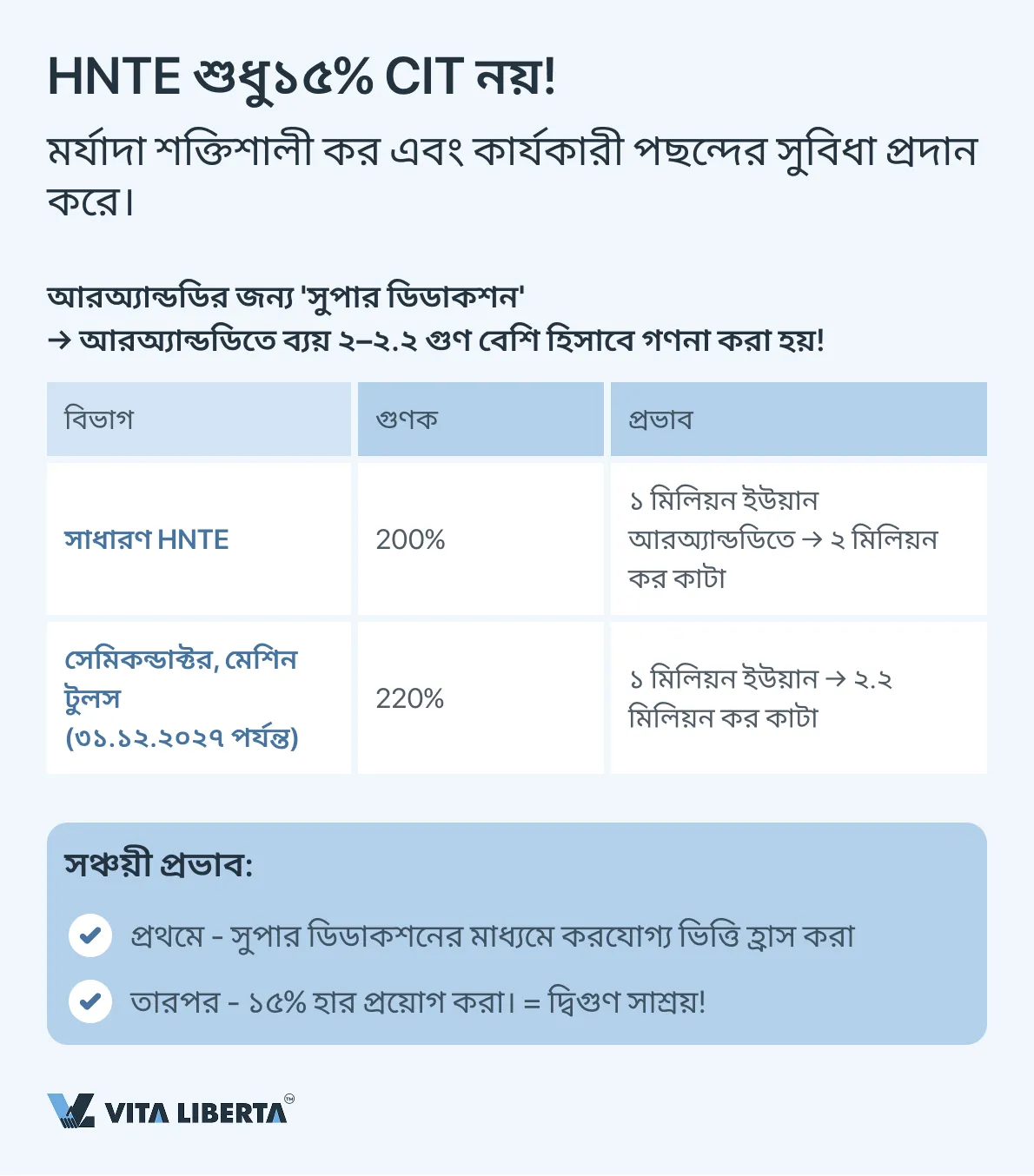 এইভাবে, HNTE মর্যাদা শুধুমাত্র করের হার কমানোর একটি হাতিয়ারই নয়, একটি কৌশলগত সম্পদও যা কোম্পানির বাজার অবস্থানকে শক্তিশালী করে, অতিরিক্ত অর্থায়নের প্রবেশাধিকার দেয় এবং চীনের উদ্ভাবনী বাস্তুতন্ত্রের সাথে মিথস্ক্রিয়া সহজ করে। এটি বজায় রাখার জন্য মানদণ্ডের সাথে সামঞ্জস্য এবং প্রশাসনিক পদ্ধতিগুলি সময়মতো উত্তীর্ণ হওয়ার উপর অবিচ্ছিন্ন মনোযোগ প্রয়োজন।