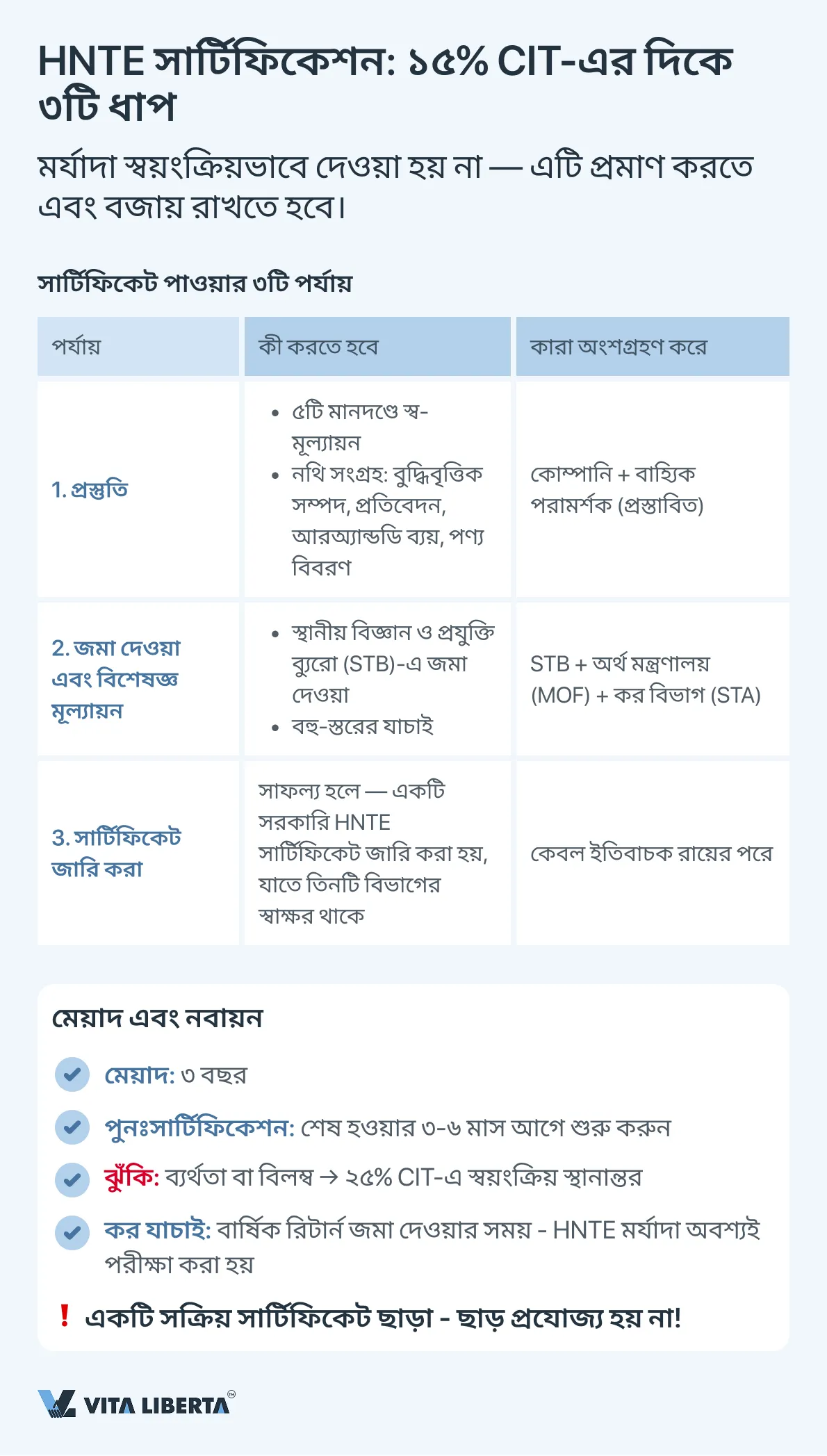 ৩. সার্টিফিকেট পাওয়া: ইতিবাচক সিদ্ধান্ত হলে কোম্পানিকে HNTE সার্টিফিকেট দেওয়া হয়, যাতে উল্লিখিত তিনটি বিভাগের স্বাক্ষর থাকে। এই সার্টিফিকেটটি পছন্দসই কর হার প্রয়োগ করার একমাত্র বৈধ ভিত্তি।