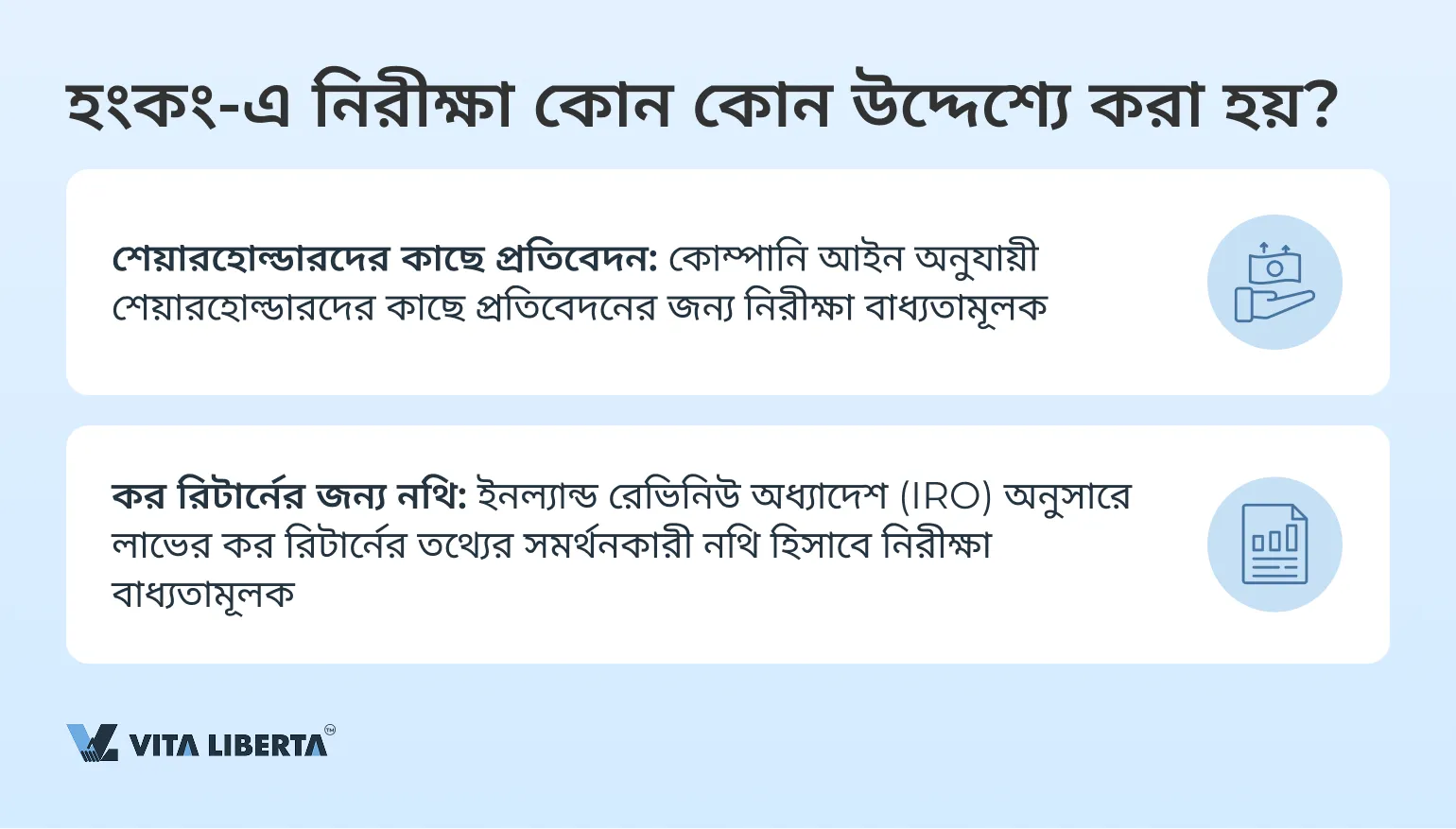 হংকং-এ ব্যবসা পরিচালনার অন্যতম গুরুত্বপূর্ণ উপাদান হল আর্থিক প্রতিবেদনের নিরীক্ষা। এই বিচারব্যবস্থায় নিবন্ধিত সকল কোম্পানির জন্য এটি কার্যক্রমের একটি বাধ্যতামূলক বিষয়। একটি নিরীক্ষা প্রতিবেদনের উপস্থিতি ব্যবসাকে কেবল আইনি প্রয়োজনীয়তা পূরণ করতে সাহায্য করে না, বরং বিনিয়োগকারী, অংশীদার এবং ব্যাংকগুলির কাছে এর নির্ভরযোগ্যতা প্রদর্শনেও সহায়তা করে।
