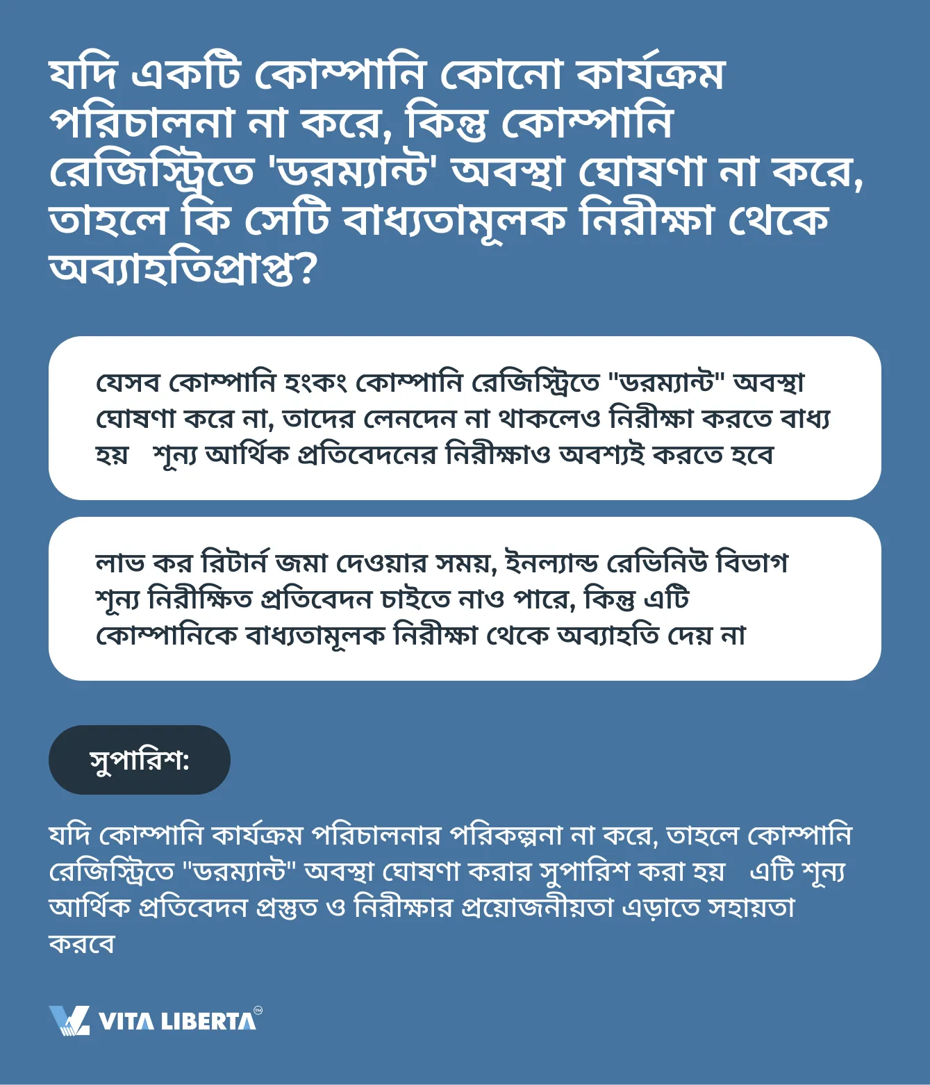 এটা বুঝতে গুরুত্বপূর্ণ যে, একটি “নিষ্ক্রিয়” কোম্পানি এমন কোম্পানি থেকে আলাদা যা সাময়িকভাবে কোনো কার্যক্রম পরিচালনা করছে না। “নিষ্ক্রিয়” কোম্পানির অবস্থাটি কোম্পানির ভিতরে আনুষ্ঠানিকভাবে оформ করতে হয় এবং হংকং কোম্পানি আইনের ৬২২ অধ্যায়ের ৪৪৭ ধারা অনুসারে কোম্পানি রেজিস্ট্রিতে আনুষ্ঠানিকভাবে ঘোষণা করতে হয়। শুধুমাত্র এই ক্ষেত্রেই কোম্পানি বাধ্যতামূলক প্রতিবেদন নিরীক্ষার ক্ষেত্রে নিয়ন্ত্রক ছাড়ের দাবি করতে পারে। অন্যদিকে, একটি নিষ্ক্রিয় কোম্পানিকে কোনো ব্যতিক্রম ছাড়াই সমস্ত আইনি প্রয়োজনীয়তা মেনে চলতে বাধ্য হয়।