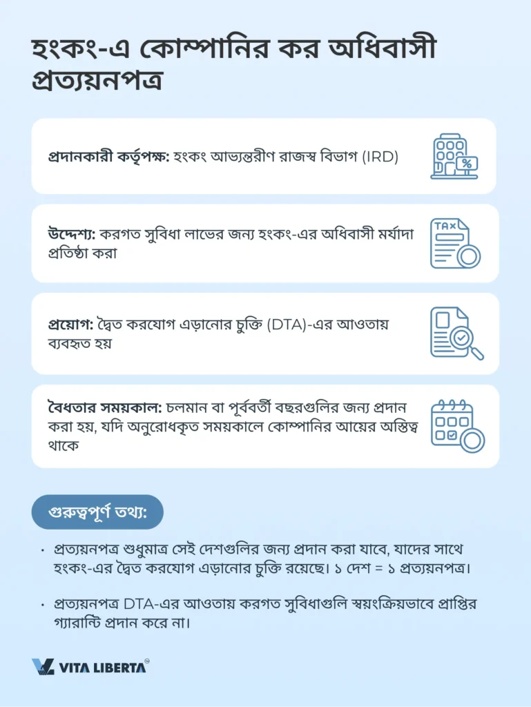 এই প্রত্যয়নপত্রটি হংকং-এর অধিবাসী মর্যাদার প্রমাণ হিসাবে কাজ করে এবং সেই দেশের ক্ষেত্রে বর্তমান বা পূর্ববর্তী কর বছরের জন্য প্রদান করা যেতে পারে, যার সাথে হংকং-এর দ্বৈত করযোগ এড়ানোর চুক্তি রয়েছে।