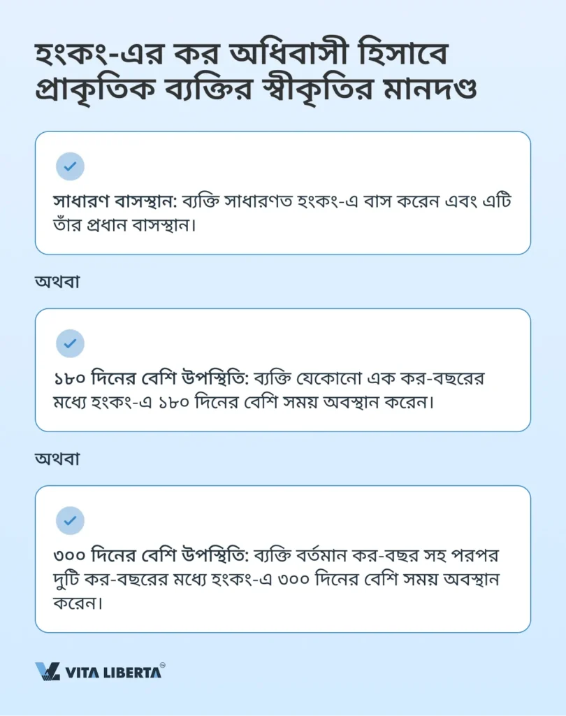 - পরপর দুই বছরে ৩০০ দিনের বেশি সময় হংকং-এ উপস্থিতি: ব্যক্তি বর্তমান কর-বছর সহ পরপর দুটি কর-বছরের মধ্যে হংকং-এ ৩০০ দিনের বেশি সময় অবস্থান করেন।.