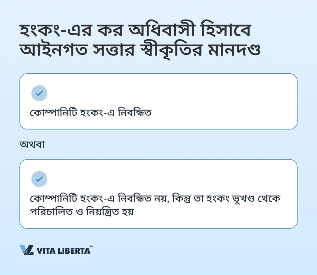 - হংকং থেকে পরিচালনা ও নিয়ন্ত্রণ: যদি কোম্পানিটি হংকং-এ নিবন্ধিত না হয়, তবে তাকে অবশ্যই হংকং ভূখণ্ড থেকে পরিচালিত ও নিয়ন্ত্রিত হতে হবে।