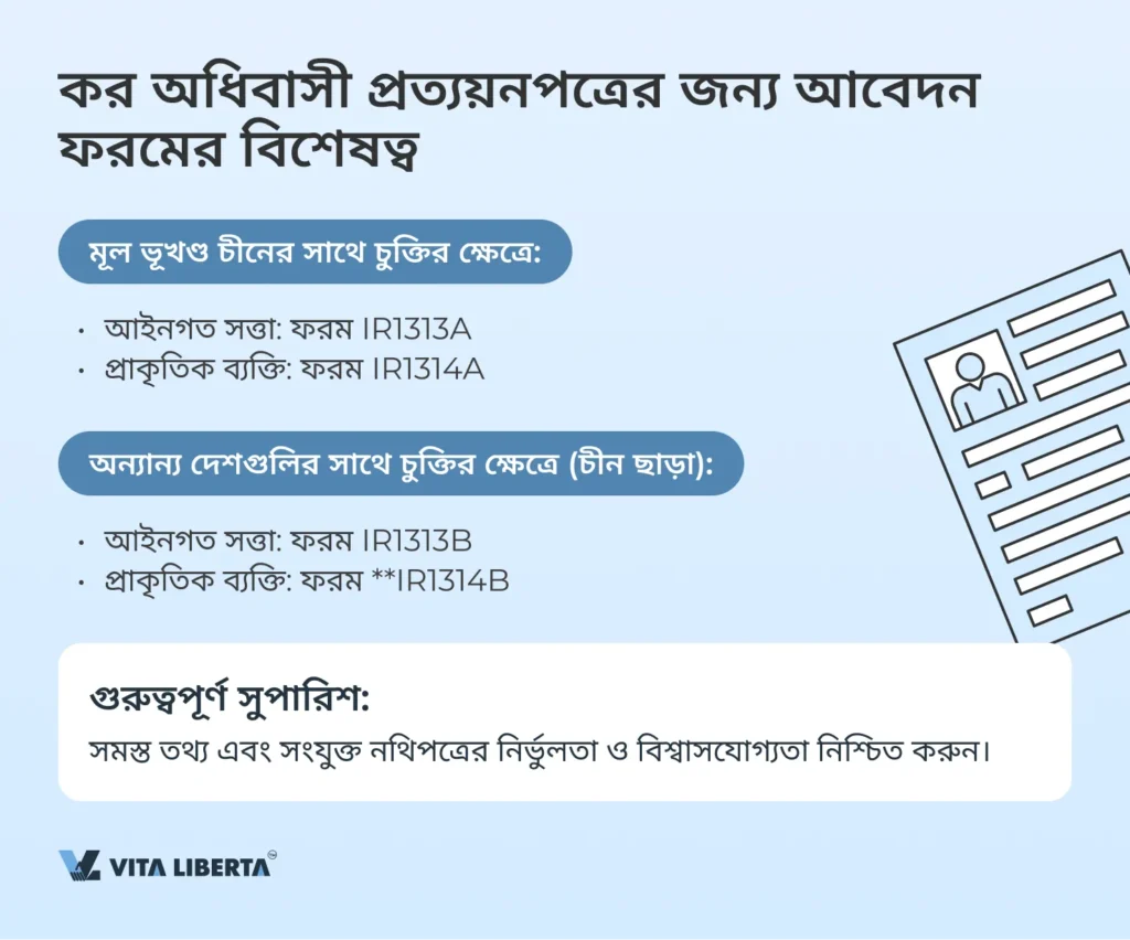 IR1313A, IR1313B, IR1314A, IR1314B ফরমের বিশেষত্ব (কর অধিবাসী মর্যাদা প্রত্যয়নপত্রের জন্য আবেদন)