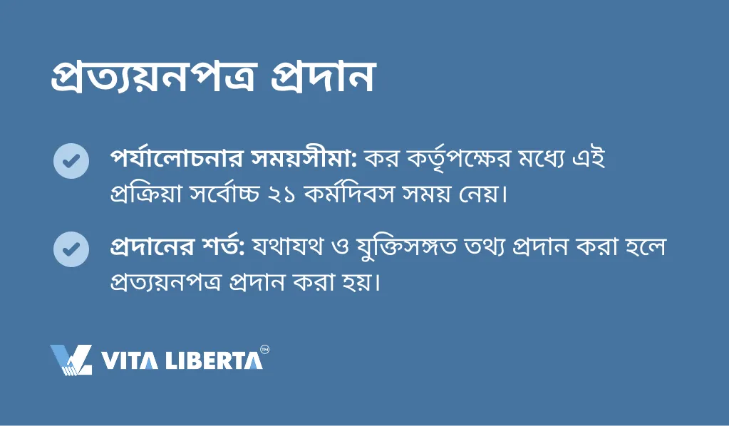 এই প্রক্রিয়াটি কয়েকটি পদক্ষেপ নিয়ে গঠিত: প্রয়োজনীয় নথিপত্র প্রস্তুত করা, আবেদনপত্র পূরণ ও জমা দেওয়া, কর কর্তৃপক্ষ কর্তৃক আবেদন পর্যালোচনা, এবং প্রত্যয়নপত্র প্রাপ্তি। বিলম্ব এড়াতে যথাযথ ও যুক্তিসঙ্গত তথ্য প্রদান করা অত্যন্ত গুরুত্বপূর্ণ।
