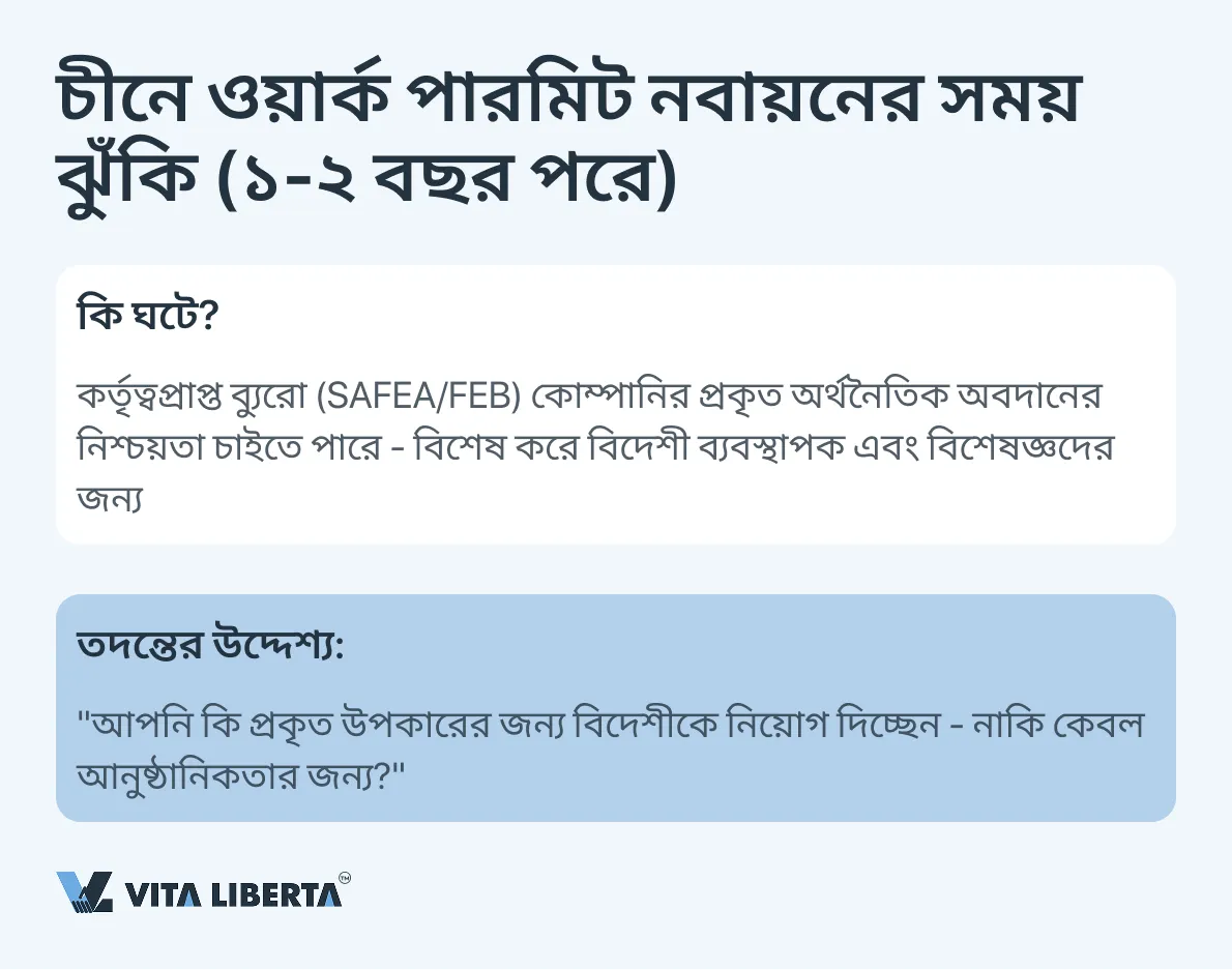 প্রাথমিক প্রক্রিয়াকরণের ১-২ বছর পর, “বিদেশীদের জন্য কাজের অনুমতি” নবায়নের প্রক্রিয়ায়, কর্তৃত্বপ্রাপ্ত Foreign Experts Bureau (FEB/SAFEA) নিয়োগকর্তা কোম্পানির প্রকৃত অর্থনৈতিক কার্যকলাপ এবং বিদেশী ব্যবস্থাপকের আরও অবস্থানের যৌক্তিকতা সম্পর্কিত একটি গভীর তদন্ত শুরু করতে পারে। তদন্তের উদ্দেশ্য হল নিশ্চিত করা যে বিদেশী কর্মী নিয়োগ স্থানীয় অর্থনীতিতে স্পষ্ট উপকার বয়ে আনে।