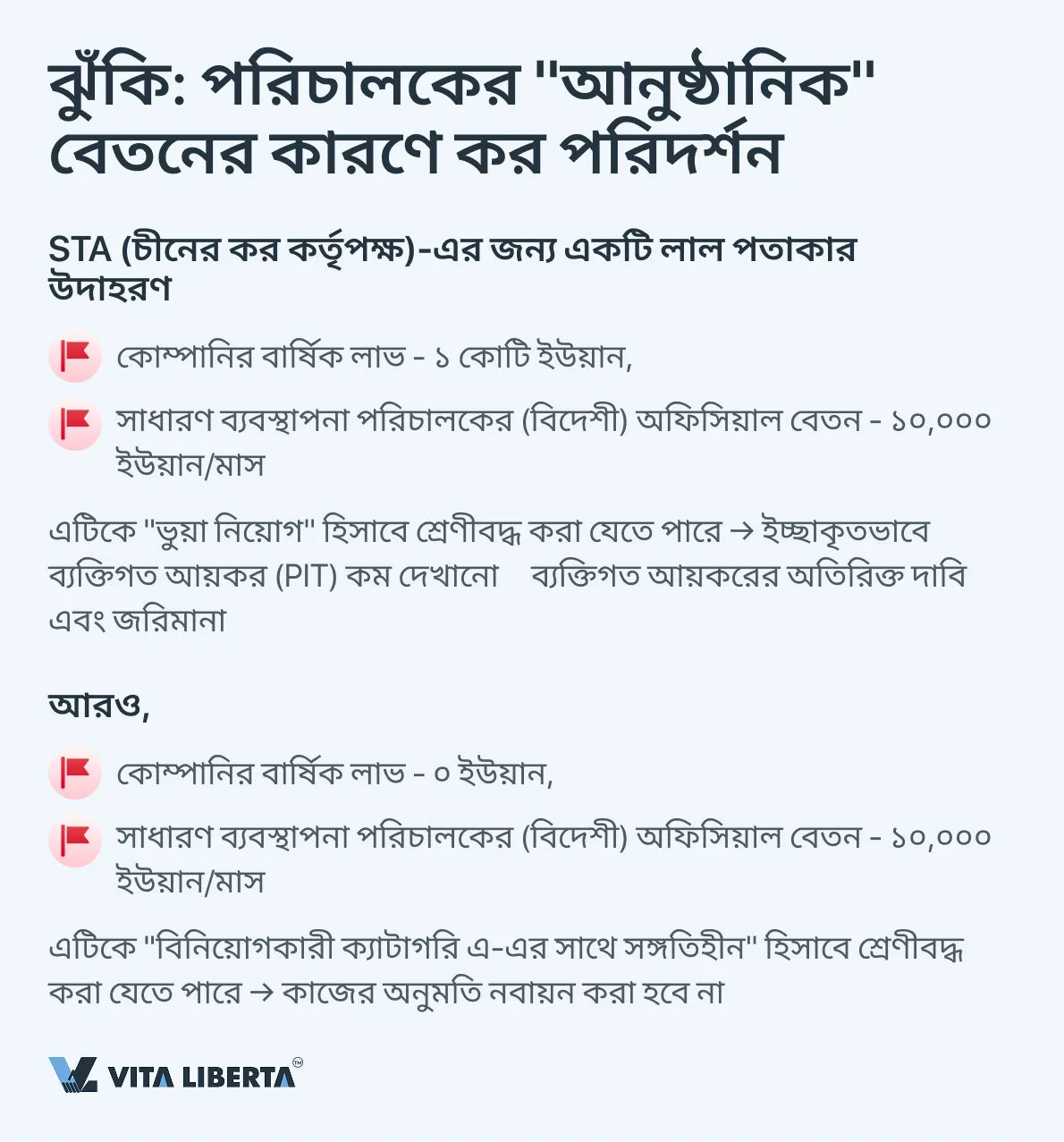 উত্তর: হ্যাঁ, এটি প্রধান ঝুঁকিগুলির মধ্যে একটি। যদি কোনও প্রধান বিদেশী ব্যবস্থাপকের অফিসিয়াল বেতন (উদাহরণস্বরূপ, ১০,০০০ ইউয়ান) কোম্পানির মুনাফার (উদাহরণস্বরূপ, লক্ষাধিক) সাথে অসামঞ্জস্যপূর্ণ হয়, তাহলে কর কর্তৃপক্ষ (STA) এটিকে PIT এড়ানোর উদ্দেশ্যে ভুয়া নিয়োগ হিসাবে বিবেচনা করতে পারে। পরিণতি – অতিরিক্ত কর দাবি, বড় জরিমানা এবং ওয়ার্ক পারমিট নবায়নে সমস্যা।