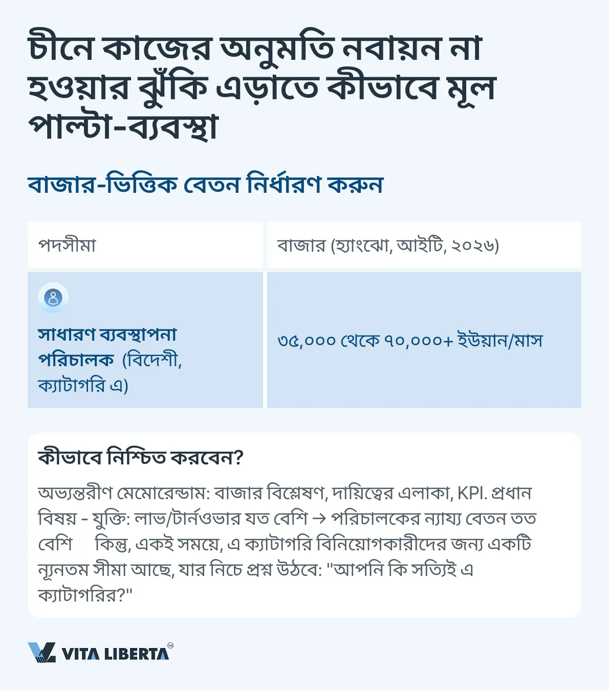 সাধারণ ব্যবস্থাপনা পরিচালকের (বিদেশী উচ্চ-দক্ষতা সম্পন্ন বিশেষজ্ঞ) বেতনের পরিমাণ তার কার্যকারিতা, অভিজ্ঞতা, শিল্প এবং আঞ্চলিক শ্রম বাজারের জন্য পর্যাপ্ত হওয়া উচিত। উদাহরণস্বরূপ, হ্যাংঝো শহরে উচ্চ-প্রযুক্তি ক্ষেত্রের জন্য অনুরূপ অবস্থানের বাজার-ভিত্তিক বেতনের পরিসর মাসে ৩৫,০০০–৫০,০০০ ইউয়ান থেকে শুরু হতে পারে।