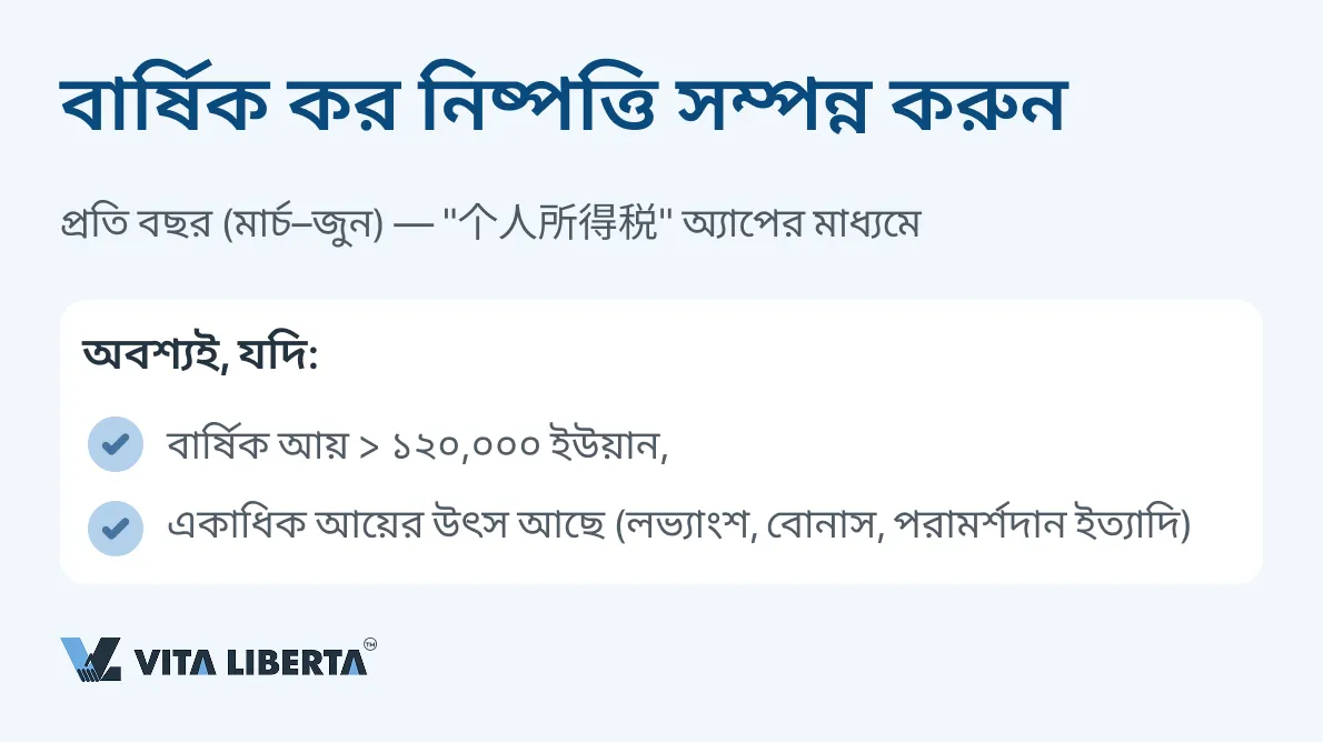 ক্যালেন্ডার বছর শেষে, সাধারণ ব্যবস্থাপনা পরিচালককে (যেকোনো বাসিন্দার মতো যার একাধিক উৎস থেকে আয় হয় বা যার বার্ষিক পরিমাণ ১২০,০০০ ইউয়ানের বেশি) “个人所得税” (ব্যক্তিগত আয়কর অ্যাপ) প্ল্যাটফর্মের মাধ্যমে চূড়ান্ত কর নিষ্পত্তি পদ্ধতি (Annual Tax Settlement) সম্পন্ন করতে হবে।