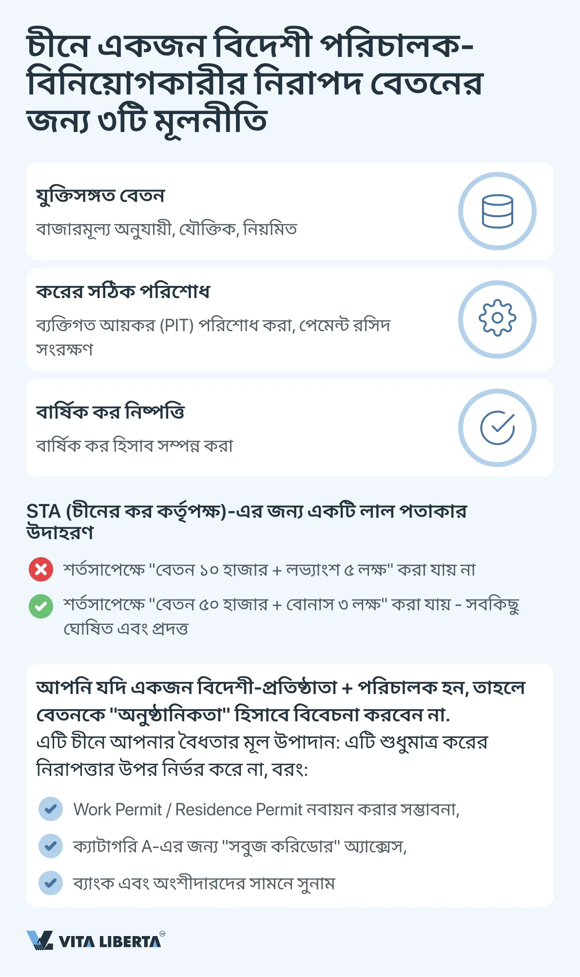 একজন বিদেশী বিনিয়োগকারী-পরিচালকের পক্ষে তার আনুষ্ঠানিক বেতনকে একটি প্রযুক্তিগত ব্যয়ের আইটেম হিসাবে বিবেচনা করা অগ্রহণযোগ্য। এর আকার অর্থনৈতিকভাবে ন্যায্য হতে হবে, এবং সমস্ত সংশ্লিষ্ট কর বাধ্যবাধকতা — পদ্ধতিগতভাবে এবং স্বচ্ছভাবে পালন করতে হবে। এই ধরনের পদ্ধতি শুধুমাত্র করের অতিরিক্ত দাবি এবং জরিমানার ঝুঁকি দূর করে না, বরং চীনের নিয়ন্ত্রক কর্তৃপক্ষের দৃষ্টিতে কোম্পানির নিষ্কলঙ্ক ব্যবসায়িক সুনাম গঠন করে।