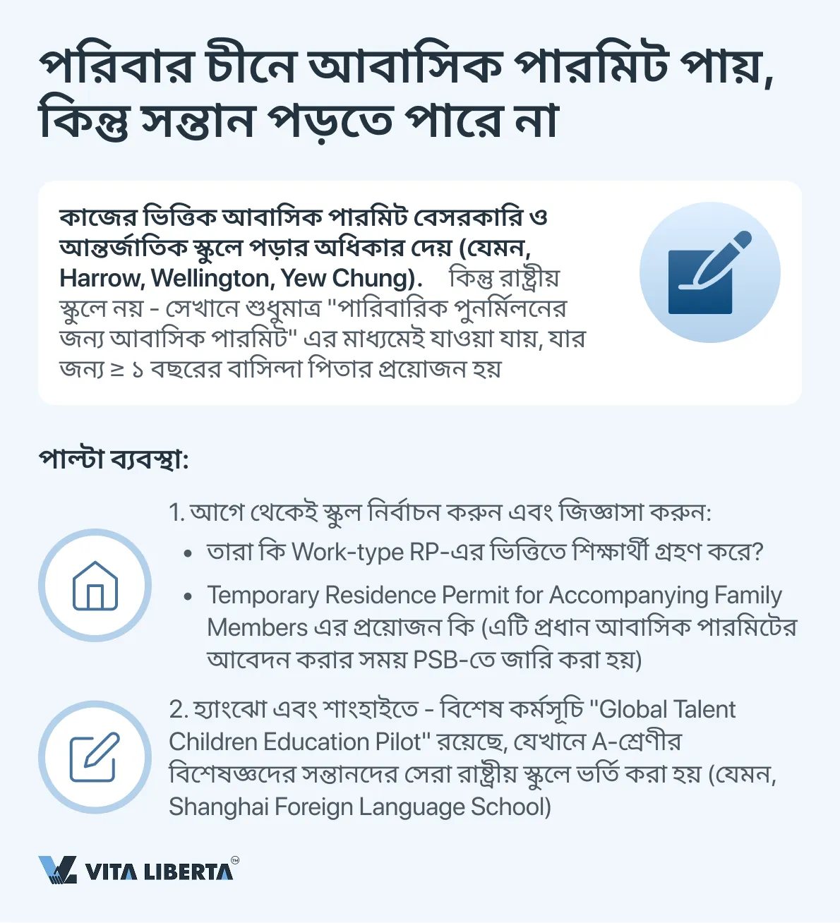 সমাধান: ১) আগে থেকেই নির্বাচিত স্কুলের সাথে আলোচনা করুন এবং Temporary Residence Permit for Accompanying Family Members প্রক্রিয়াকরণ করুন। ২) উচ্চ-দক্ষতাসম্পন্ন বিশেষজ্ঞদের (ক্যাটাগরি A) জন্য আঞ্চলিক প্রোগ্রাম সম্পর্কে জানুন, উদাহরণস্বরূপ, শাংহাই/হ্যাংঝোতে গ্লোবাল ট্যালেন্ট চিলড্রেন এডুকেশন পাইলট। ৩) ভবিষ্যতে পারিবারিক রেসিডেন্স পারমিটে (Reunion-type) রূপান্তর করুন, যা সম্পূর্ণ প্রবেশাধিকার খুলে দেয়।