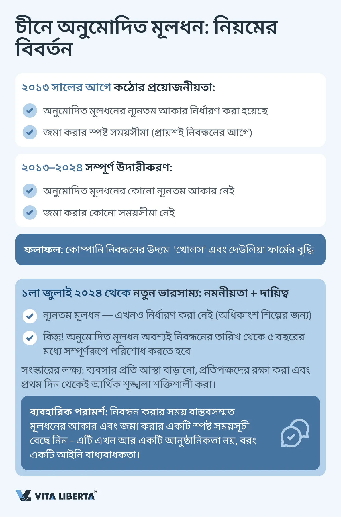 ২০১৩ সালের আগে, চীনে এমন একটি ব্যবস্থা চালু ছিল যা প্রতিষ্ঠাতাদের কঠোরভাবে নির্ধারিত সময়সীমা এবং ন্যূনতম সীমার মধ্যে মূলধন জমা করতে বাধ্য করত। ২০১৩ সালের উদারীকরণ সংস্কার অধিকাংশ শিল্পের জন্য সময়সীমা এবং ন্যূনতম পরিমাণ উভয়ই বাতিল করে, প্রক্রিয়াটিকে শেয়ারহোল্ডারদের বিবেচনার উপর ছেড়ে দেয়, যার ফলে নিবন্ধনের উদ্যম দেখা দেয়, কিন্তু এটি ‘খোলস’ কোম্পানি সংক্রান্ত ঝুঁকিও তৈরি করে। ১লা জুলাই ২০২৪ থেকে কার্যকর হওয়া চীনের কোম্পানি আইনের নতুন সংশোধিত সংস্করণ, একটি আপডেট ফর্ম্যাটে নিয়ন্ত্রিত মডেলে ফিরে আসার ইঙ্গিত দেয়।