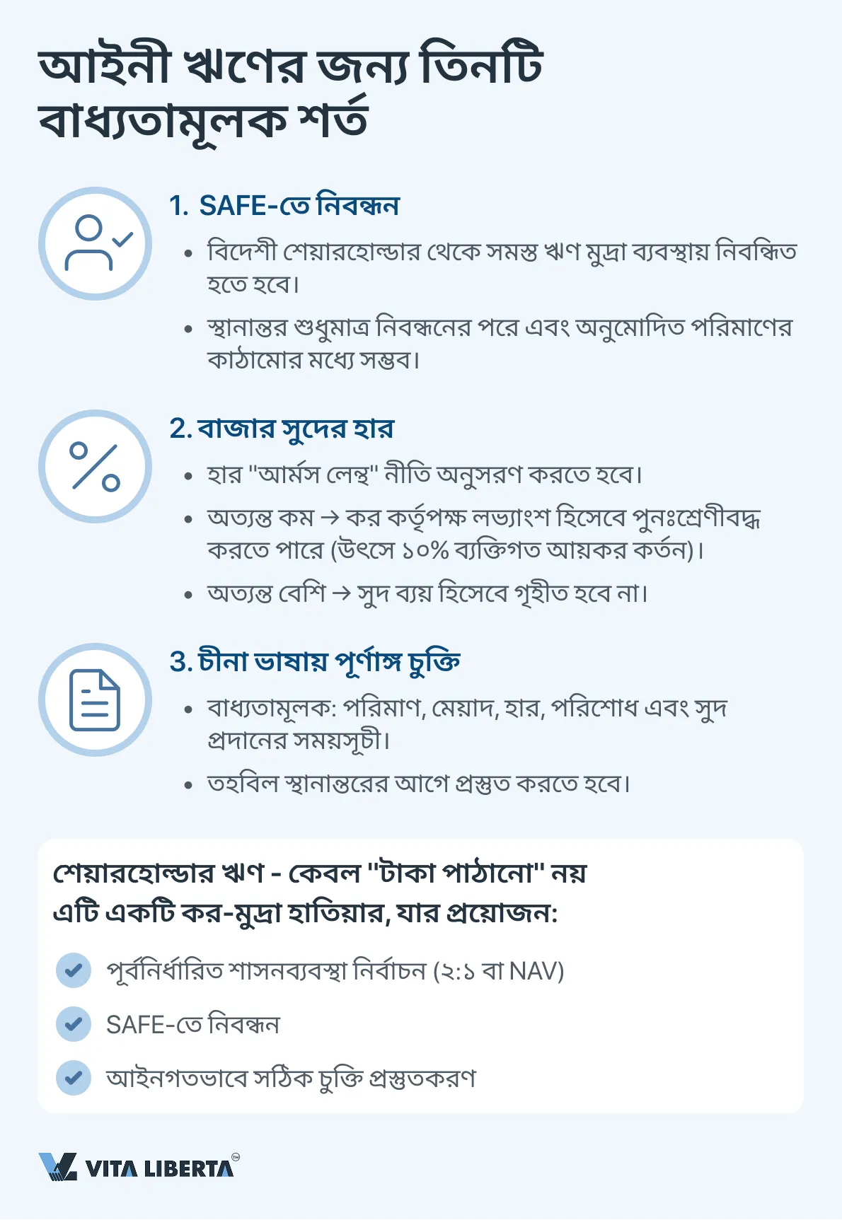 শেয়ারহোল্ডার ঋণ একটি শক্তিশালী কিন্তু জটিলভাবে নিয়ন্ত্রিত হাতিয়ার। এর কার্যকর ব্যবহার শুধুমাত্র বিনিয়োগকারীর কাছে তহবিলের প্রাপ্যতা নয়, বরং একটি একীভূত পদ্ধতিরও প্রয়োজন যা কর্পোরেট অর্থায়ন, কর অপ্টিমাইজেশন এবং মুদ্রা আইনের শর্তহীন সম্মতিকে একত্রিত করে। সঠিকভাবে কাঠামোগত ঋণ প্রকল্পের আর্থিক দক্ষতা বাড়ায়, যেখানে পরিকল্পনায় ভুলগুলি উল্লেখযোগ্য রাজস্ব ক্ষতি এবং প্রশাসনিক ঝুঁকির দিকে নিয়ে যেতে পারে।