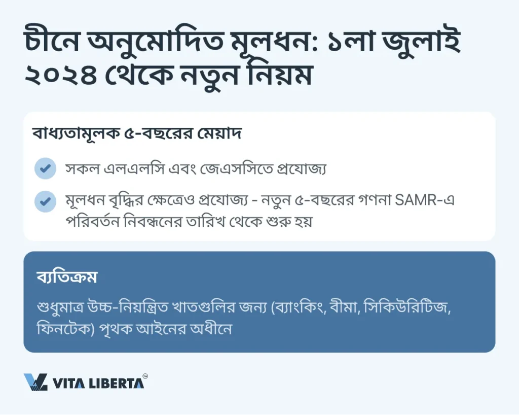 ৫ বছরের নীতি এখন অনুমোদিত পুঁজি বৃদ্ধির পদ্ধতিতেও প্রযোজ্য। ১লা জুলাই ২০২৪ বা তার পরে নিবন্ধিত বৃদ্ধির জন্য, অতিরিক্ত অবদানের জন্য নতুন সময়সীমার গণনা SAMR-এ সংশ্লিষ্ট পরিবর্তন নিবন্ধনের তারিখ থেকে শুরু হবে।