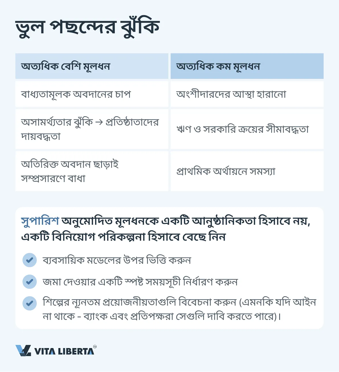 | ১. পরিশোধের সময়সীমা | নিবন্ধনের তারিখ থেকে ৫ বছর — নতুন কোম্পানির (০১.০৭.২০২৪ এর পরে) জন্য কঠোর নিয়ম। পূর্বে তৈরি কোম্পানির জন্য — তাদের সময়সূচী সামঞ্জস্য করার জন্য ৩০.০৬.২০২৭ পর্যন্ত পরিবর্তনকালীন সময়। | ৫ বছরের একটি বাস্তবসম্মত অর্থায়নের সময়সূচীর উপর ভিত্তি করে মূলধনের আকার গণনা করুন। “সাবধানে” সংখ্যাটি অতিরিক্ত নির্ধারণ করবেন না। |