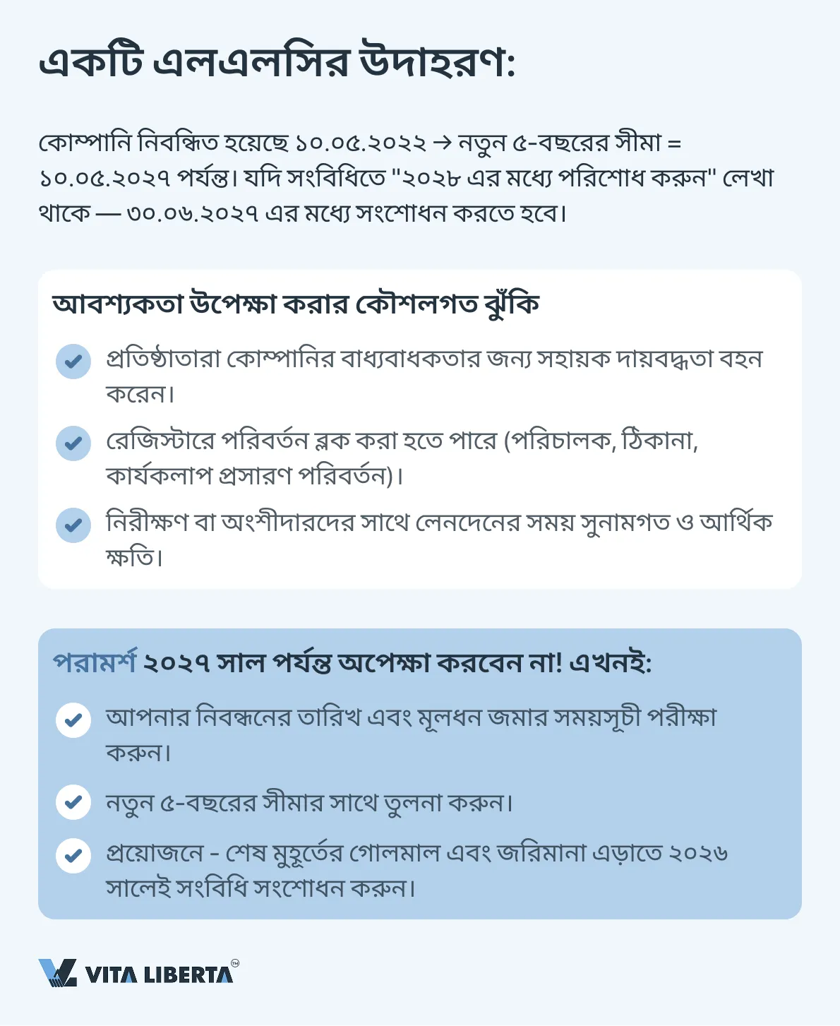 গুরুত্বপূর্ণ সূক্ষ্মতা: যে সকল এলএলসি-এর বিদ্যমান পরিশোধের সময়সূচী ইতিমধ্যেই নতুন ৫-বছরের সীমার (তাদের মূল নিবন্ধনের তারিখ থেকে গণনা করা) মধ্যে পড়ে, তাদের জন্য আনুষ্ঠানিকভাবে সংবিধি সংশোধনের প্রয়োজন নেই। তবে, অভ্যন্তরীণ নিরীক্ষা পরিচালনা এবং সম্মতির সনদপত্র পাওয়ার পরামর্শ দেওয়া হয়।