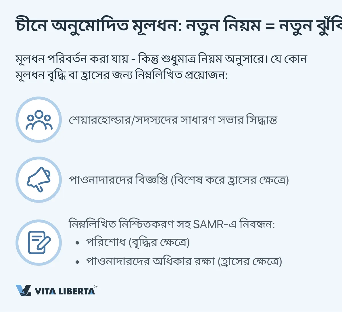 | ৫. প্রকাশ্যতা | মূলধনে কোন পরিবর্তন (পরিমাণ, ফর্ম, সময়সূচী) ২০ কার্যদিবসের মধ্যে gsxt.gov.cn এ প্রকাশ করতে হবে। এটি আপনার সর্বজনীন সুনামের ভিত্তি। | সিস্টেমে ডেটা নিয়মিত হালনাগাদ করার জন্য একজন দায়িত্বশীল ব্যক্তি নিয়োগ করুন। ব্যাংক এবং অংশীদাররা প্রথমে এই তথ্য পরীক্ষা করে। |