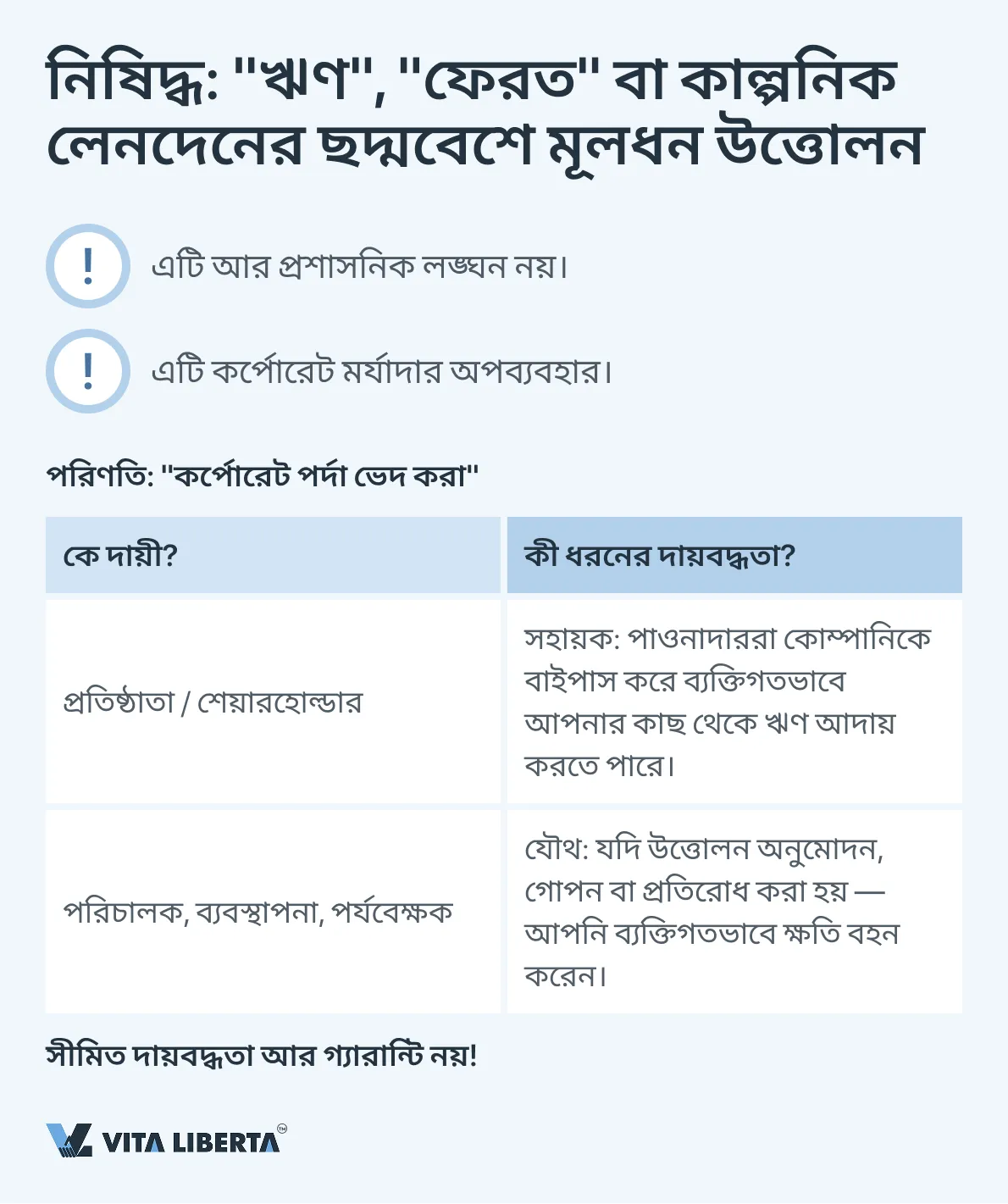 জমা দেওয়া মূলধনের অবৈধ উত্তোলন (ঋণের ছদ্মবেশে, কাল্পনিক লেনদেন বা প্রত্যাবর্তনের মাধ্যমে) একটি গুরুতর লঙ্ঘন। পাওনাদার বা নিয়ন্ত্রকরা “কর্পোরেট পর্দা ভেদ করার” (piercing the corporate veil) পদ্ধতি শুরু করতে পারেন। এই ক্ষেত্রে, প্রতিষ্ঠাতারা (শেয়ারহোল্ডাররা), সেইসাথে এই লেনদেন অনুমোদনকারী পরিচালক এবং ব্যবস্থাপকরা, কোম্পানির ঋণের জন্য সহায়ক (ব্যক্তিগত) দায়বদ্ধতা তাদের সমস্ত ব্যক্তিগত সম্পত্তির সাথে বহন করেন। এই পরিস্থিতিতে কোম্পানির সীমিত দায়বদ্ধতা প্রযোজ্য হয় না।