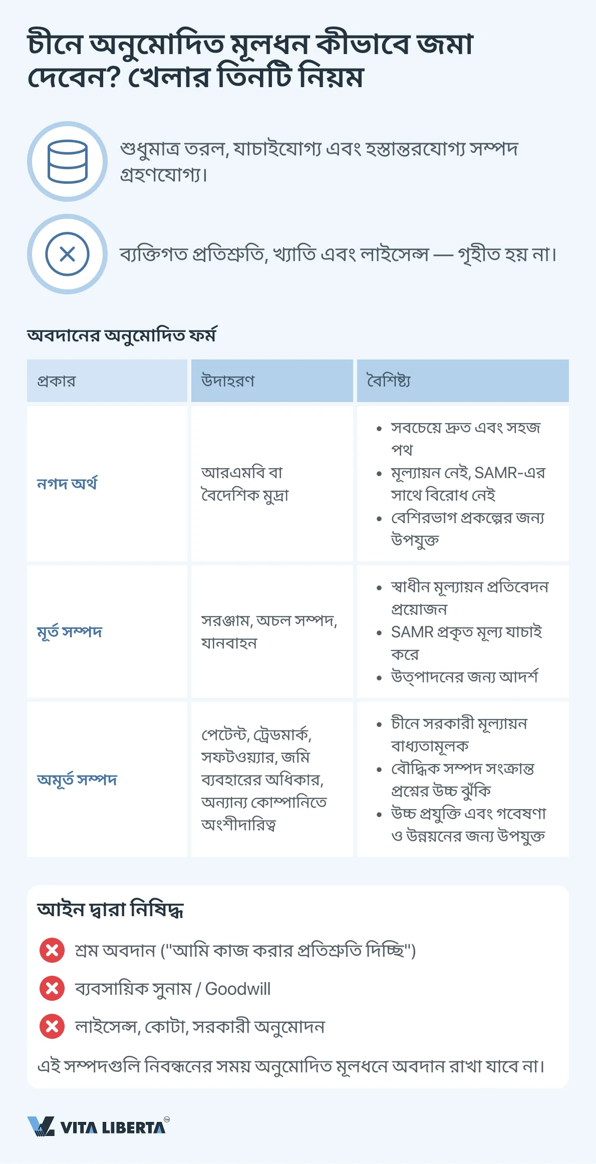 | ৩. অবদানের ফর্ম | করা যেতে পারে: নগদ (সবচেয়ে ভাল), সরঞ্জাম, বৌদ্ধিক সম্পদ, জমির অধিকার, অন্যান্য ফার্মে অংশীদারিত্ব। করা যাবে না: শ্রম, সুনাম, প্রতিশ্রুতি, লাইসেন্স। | নগদ অবদানকে অগ্রাধিকার দিন। অন্য কোন সম্পদের জন্য চীনে বাধ্যতামূলক স্বাধীন মূল্যায়ন প্রয়োজন। |