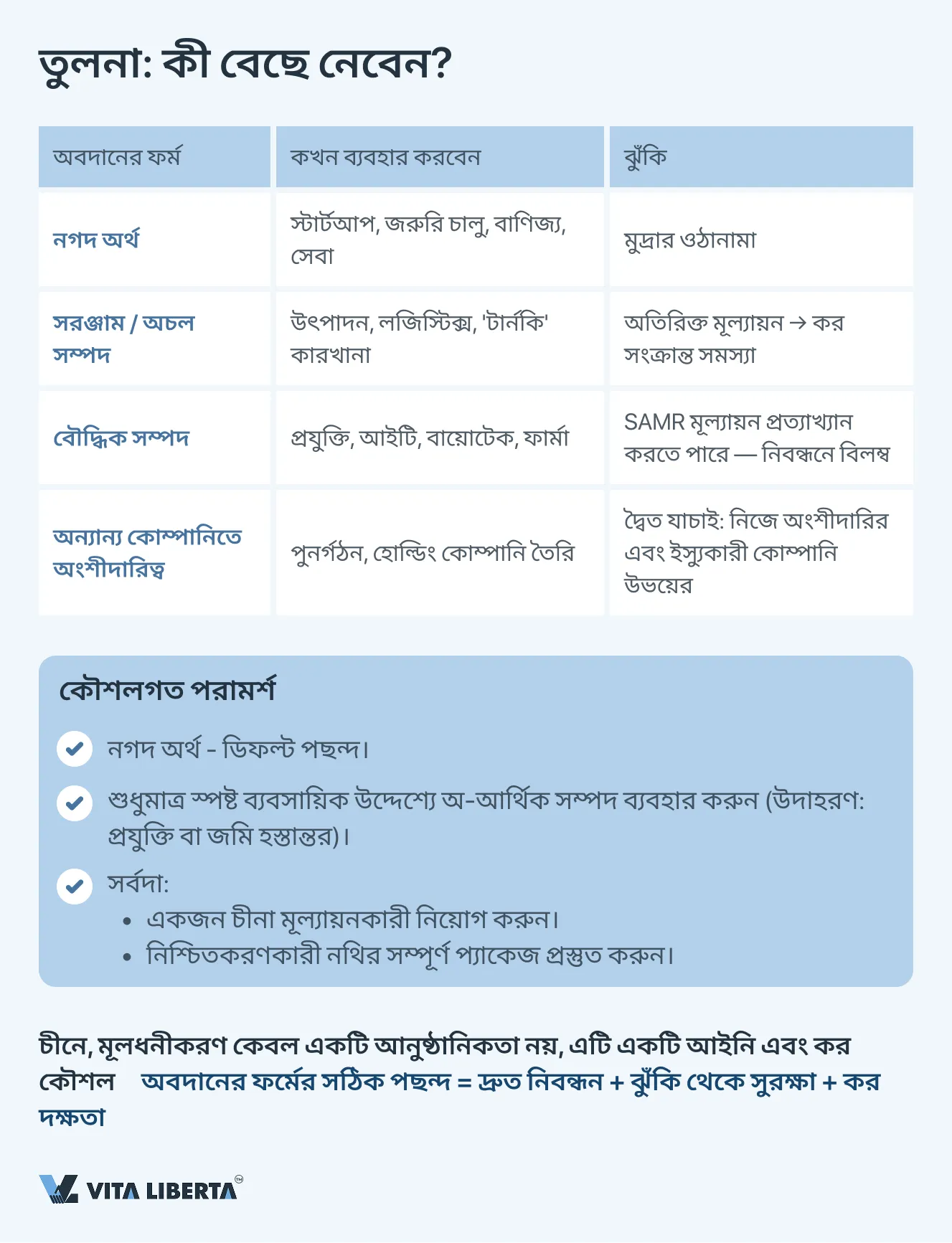 মুদ্রায় (আরএমবি বা বৈদেশিক) নগদ অবদান সবচেয়ে অনুমানযোগ্য এবং সমস্যামুক্ত উপায়। এটির জন্য অতিরিক্ত মূল্যায়ন পদ্ধতির প্রয়োজন হয় না, নিবন্ধনের সময়সীমা কমিয়ে আনে এবং SAMR এর তদন্তের সময় বিষয়ভিত্তিকতা দূর করে। বিদেশী বিনিয়োগকারীর জন্যও, এটি অর্থ রূপান্তর এবং সীমান্ত-পার্শ্বীয় স্থানান্তরের সবচেয়ে স্বচ্ছ পথ।