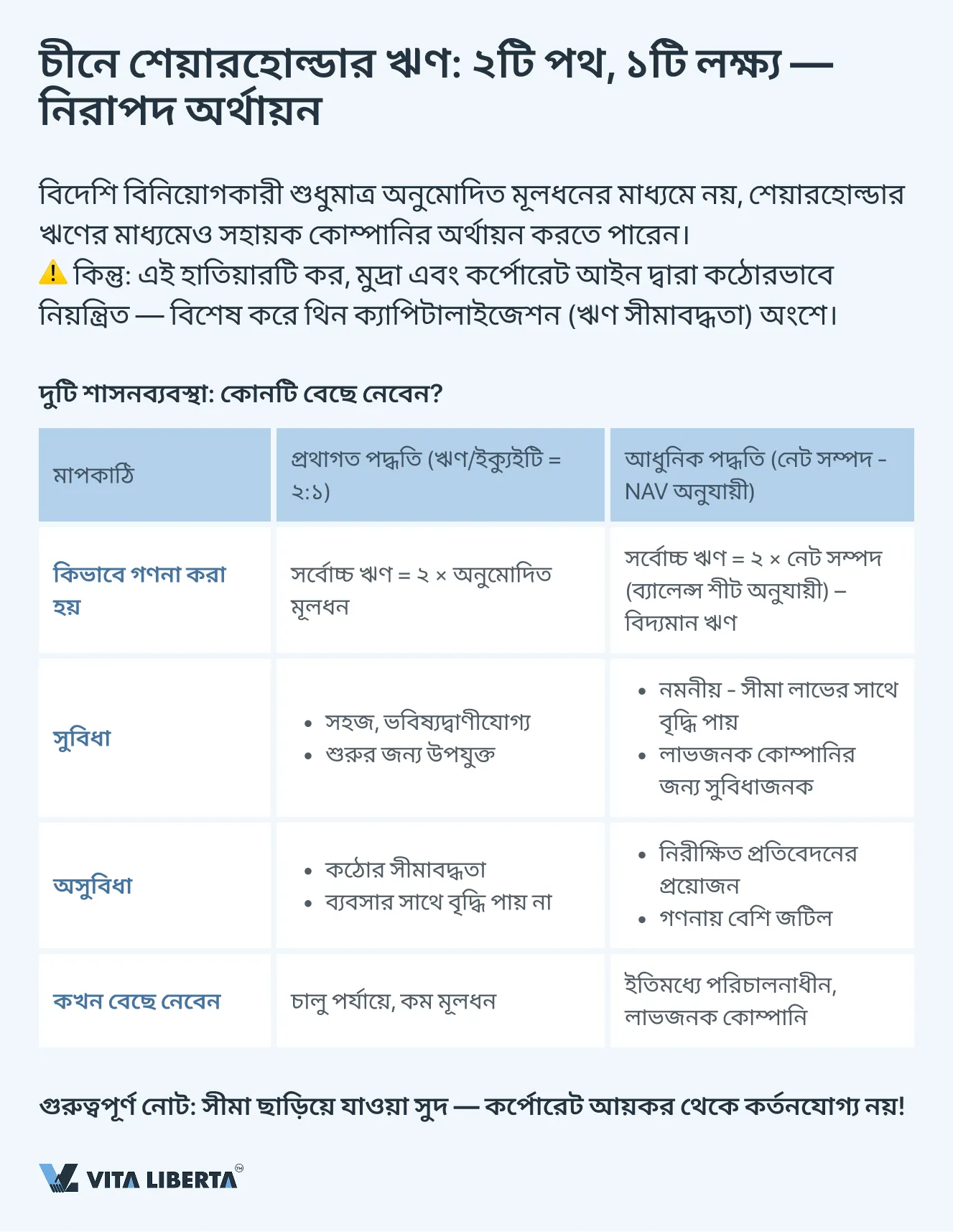 অনুমোদিত মূলধন জমা দেওয়া ছাড়াও, বিদেশি বিনিয়োগকারীর তাদের চীনা সহায়ক কোম্পানির জন্য অতিরিক্ত অর্থায়নের একটি গুরুত্বপূর্ণ হাতিয়ার রয়েছে – শেয়ারহোল্ডার ঋণ (shareholder loans)। এই ব্যবস্থাটি প্রকল্পের তারল্যতা নমনীয়ভাবে পরিচালনা করতে দেয়, তবে এটি কর্পোরেট, মুদ্রা এবং, গুরুত্বপূর্ণভাবে, কর আইনের নিয়ম দ্বারা কঠোরভাবে নিয়ন্ত্রিত হয়, যা কর ভিত্তিকে ক্ষয় (thin capitalization rules) প্রতিরোধের লক্ষ্যে।
