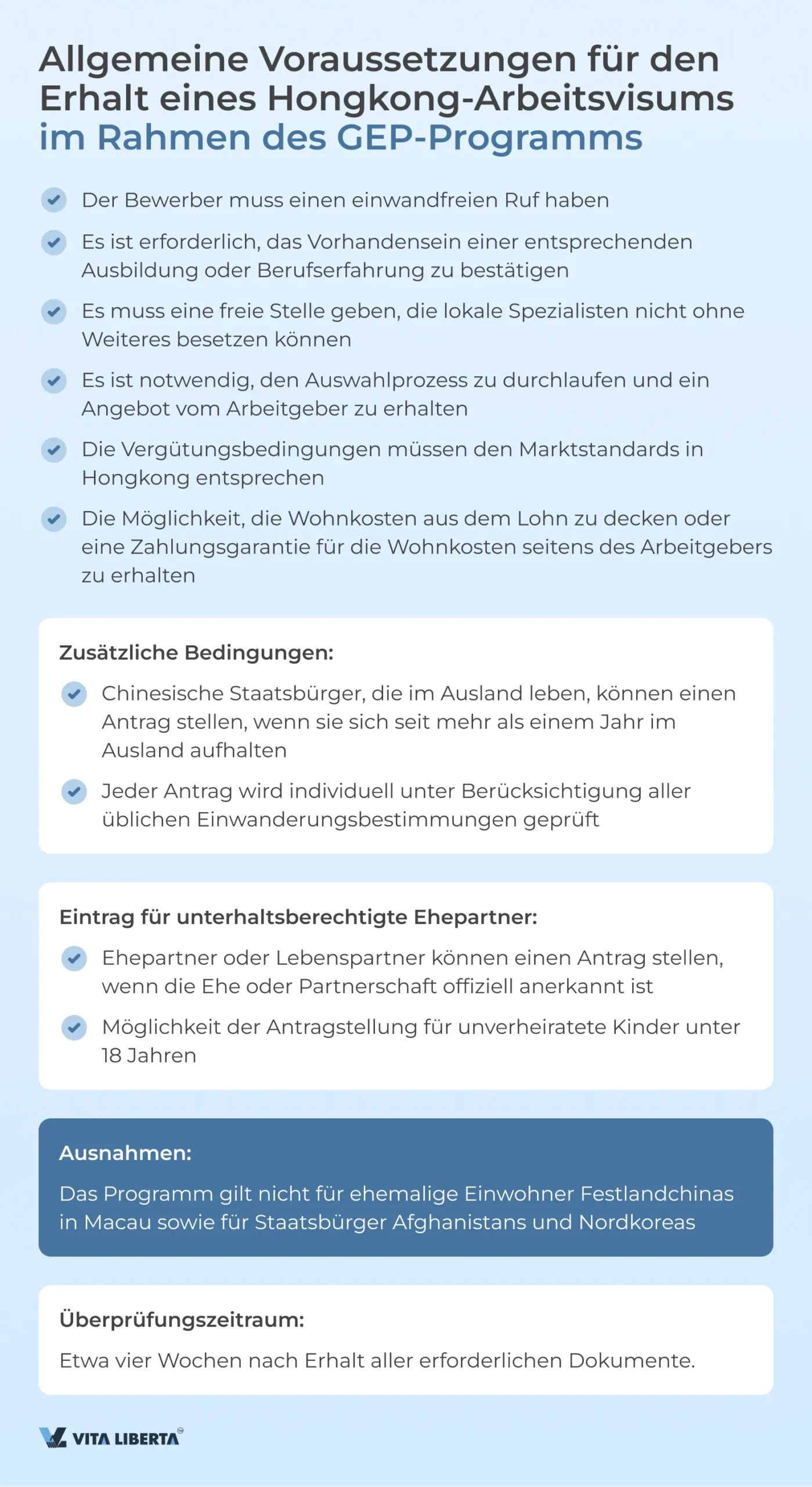 Um ein GEP-Visum zu erhalten, benötigen Sie einen Universitätsabschluss oder eine vergleichbare Qualifikation, ein Jobangebot eines Unternehmens in Hongkong, ein marktgerechtes Gehalt und dürfen keine rechtlichen Probleme haben. Der Arbeitgeber muss nachweisen, dass die Stelle nicht mit lokalen Fachkräften besetzt werden kann.