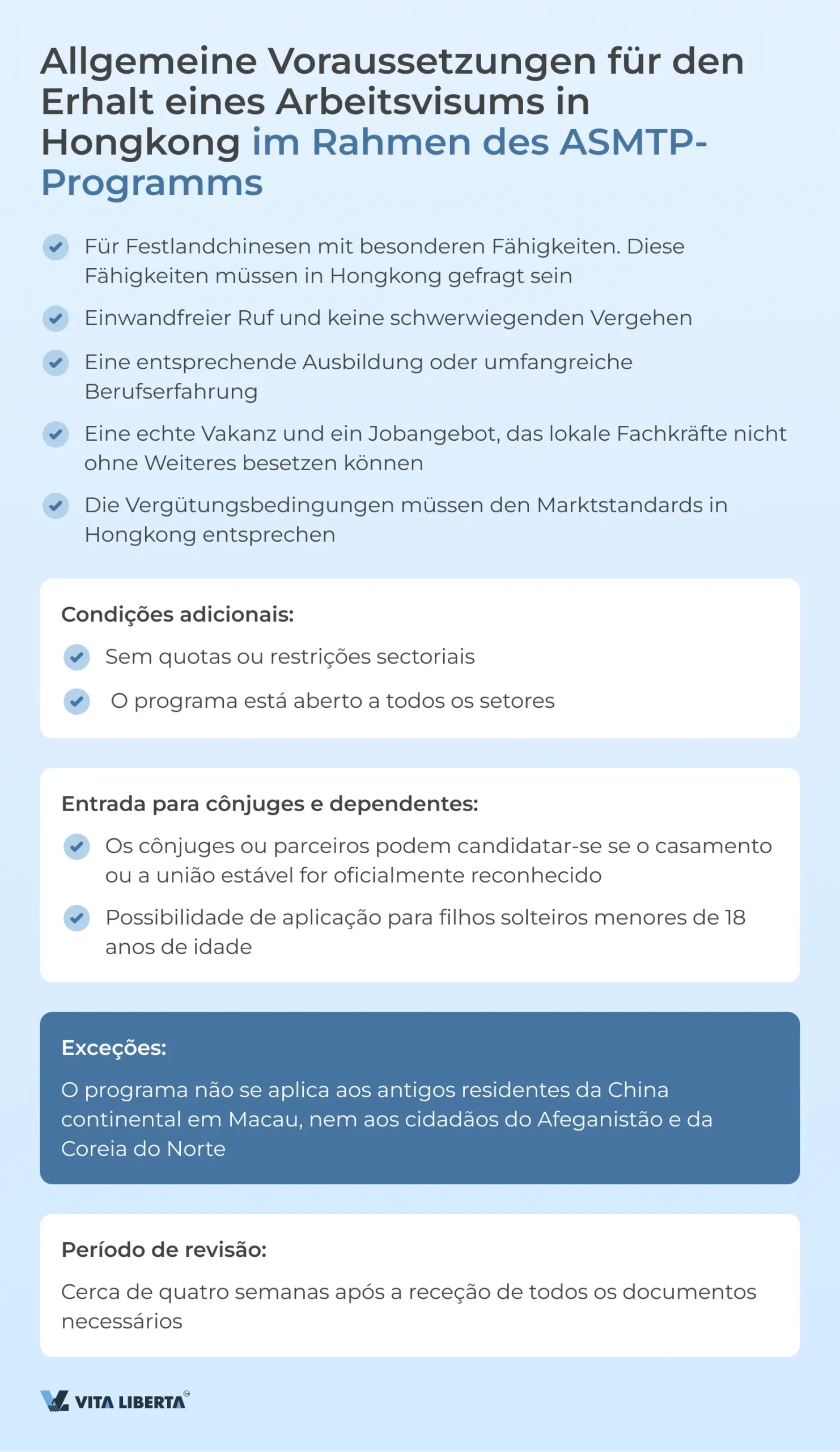 Das ASMTP-Programm richtet sich an qualifizierte Fachkräfte vom chinesischen Festland, die wichtige Branchen der Hongkonger Wirtschaft unterstützen. Um ein ASMTP-Visum zu erhalten, müssen Bewerber einschlägige Berufserfahrung und Qualifikationen für die jeweilige Stelle nachweisen.