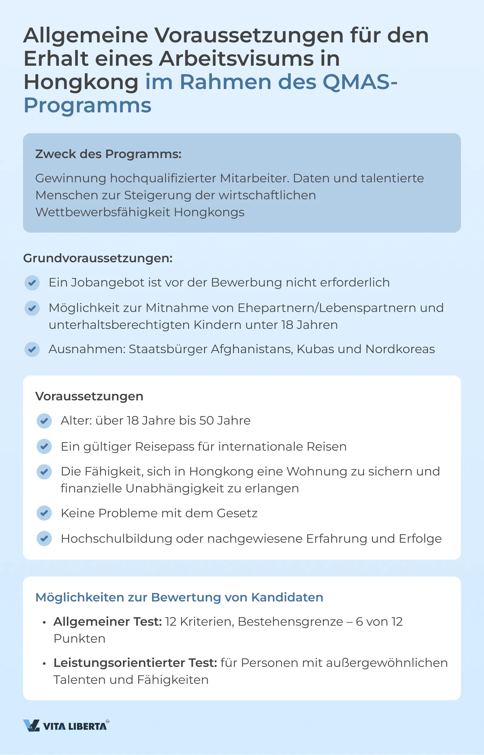 QMAS basiert auf einem Punktesystem, das Faktoren wie Ausbildung, Berufserfahrung und Sprachkenntnisse bewertet. Das Programm richtet sich an hochqualifizierte Fachkräfte, die zur Entwicklung Hongkongs beitragen können. Ein wesentlicher Vorteil von QMAS ist die Möglichkeit, ein Visum unabhängig von einem bestimmten Arbeitgeber zu erhalten.